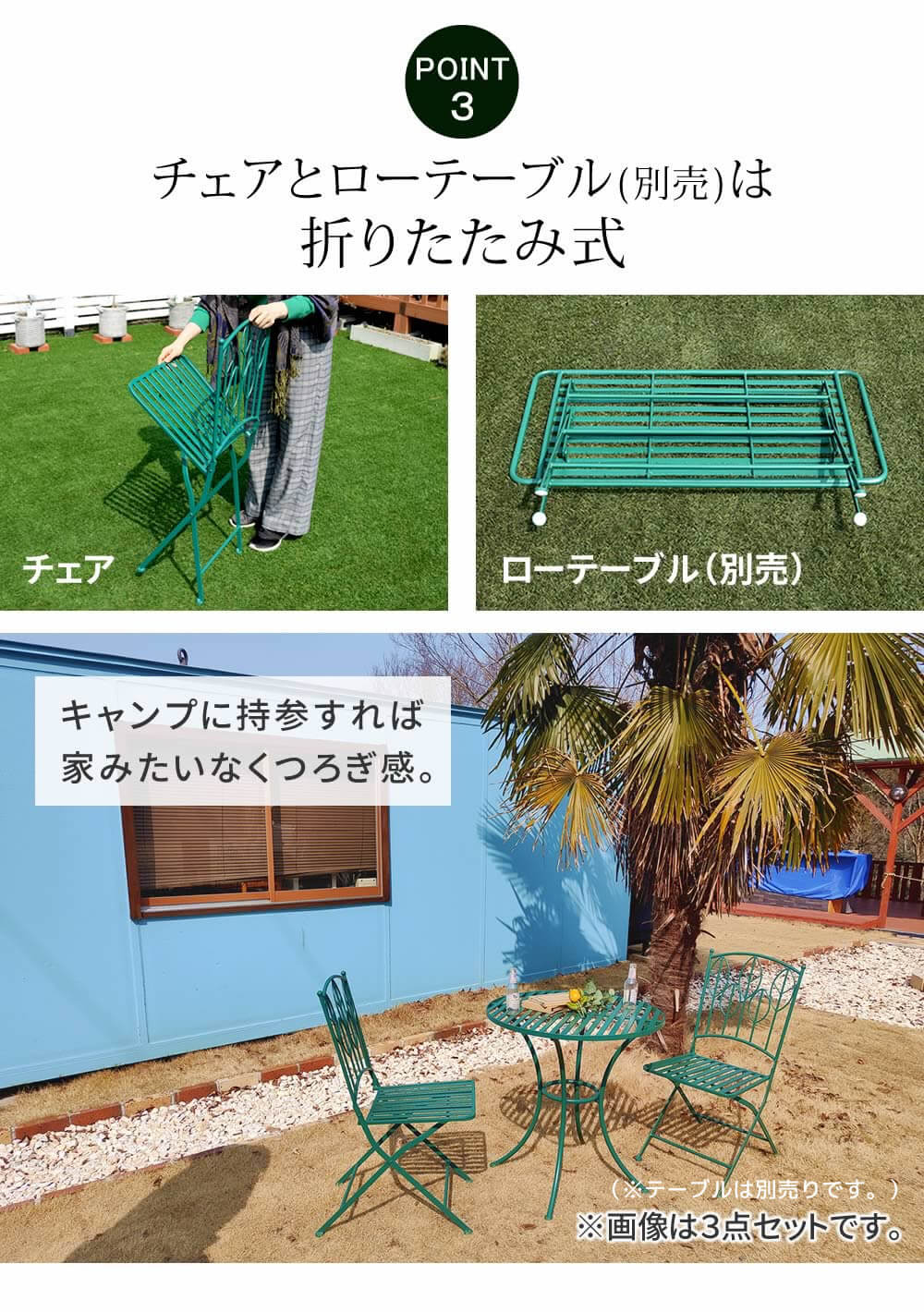 椅子は折りたたみ式ですが、風が強い日も安定してお使い頂けるよう、重みやバランスを工夫しています。