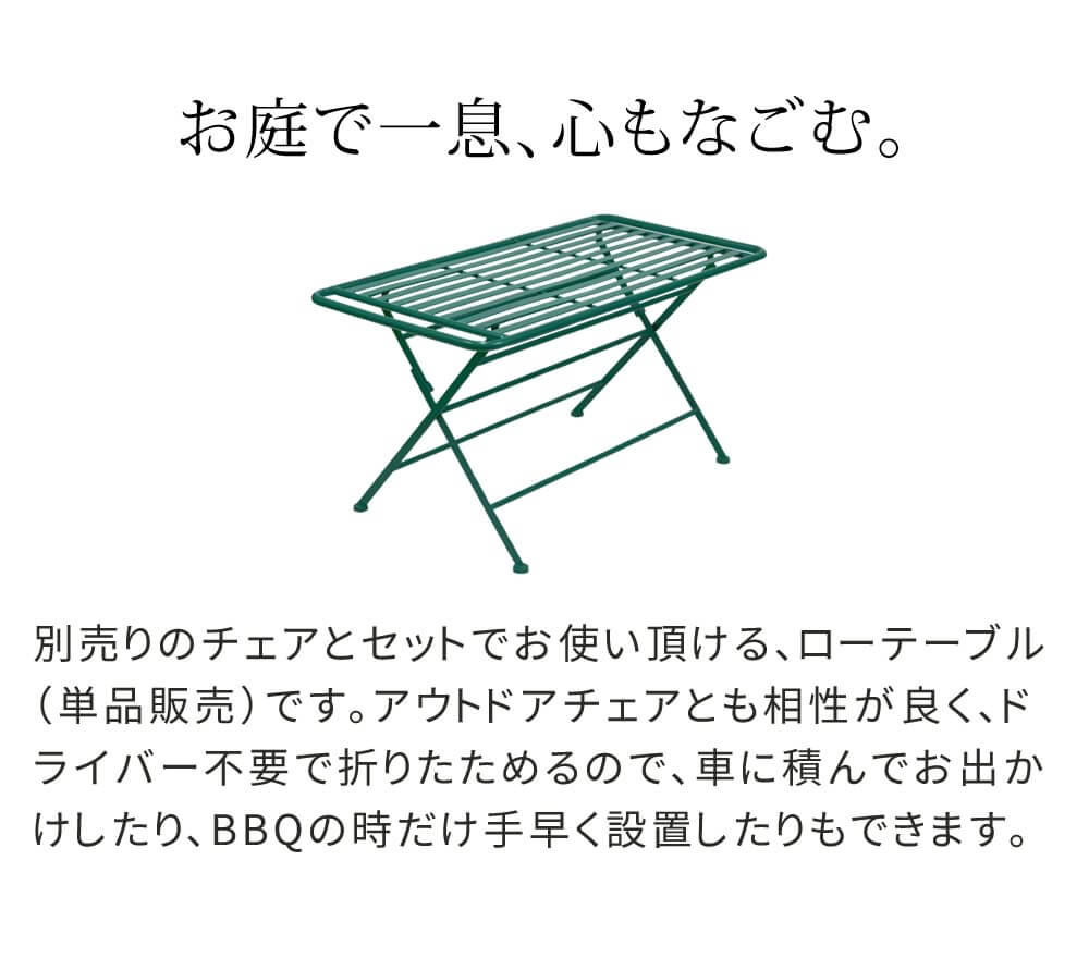 アウトドアチェアとも相性が良く、ドライバー不要で折り畳み可能なので、車に積んでお出かけしたり、BBQの時だけ手早く設置したりもできます。