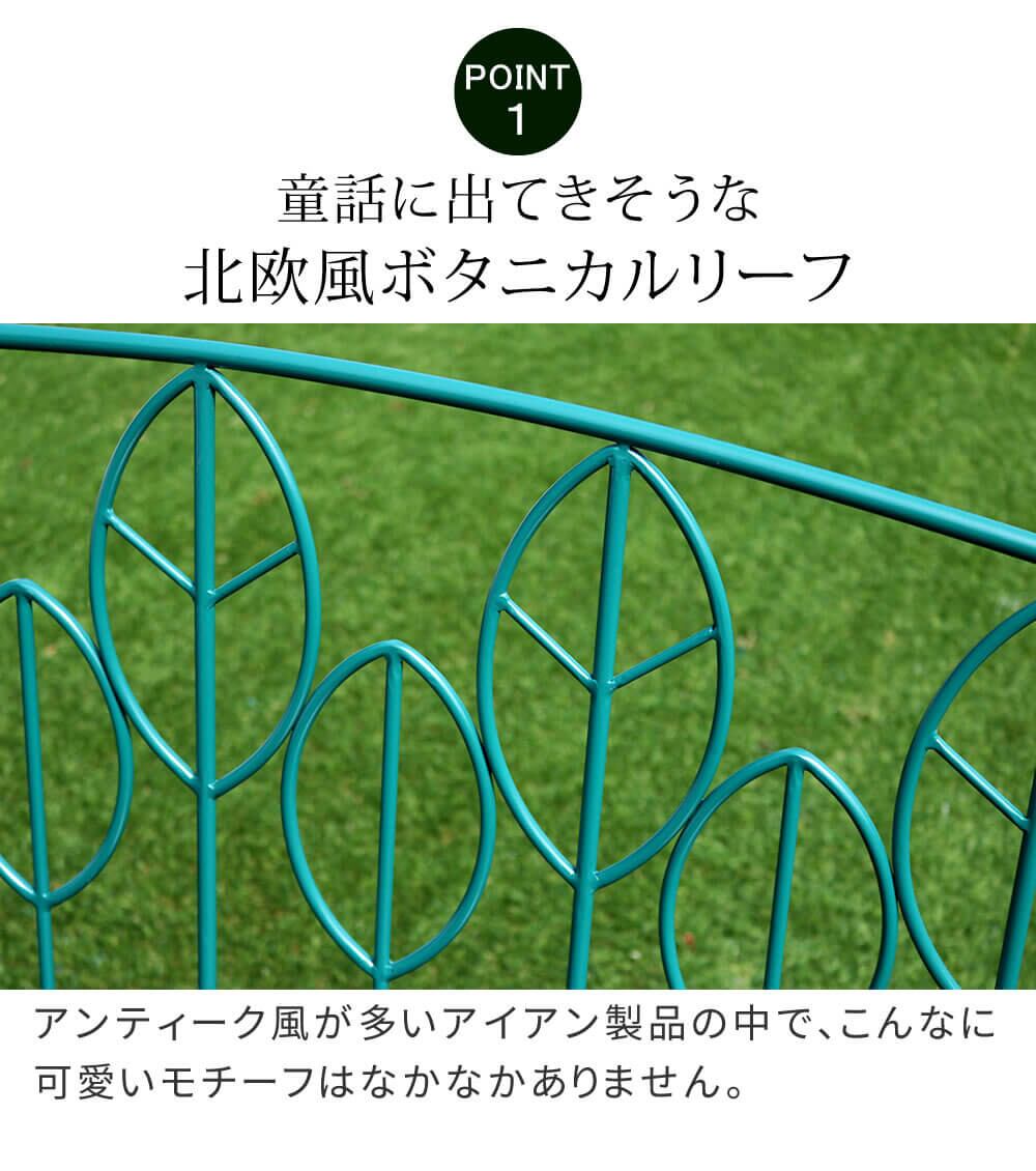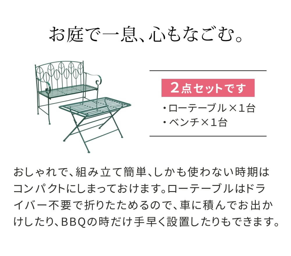 100cm幅の折り畳み式のアイアンガーデンテーブル1台と、2人掛けのガーデンベンチ1脚、合計2点がセットになったガーデンテーブルセットです。