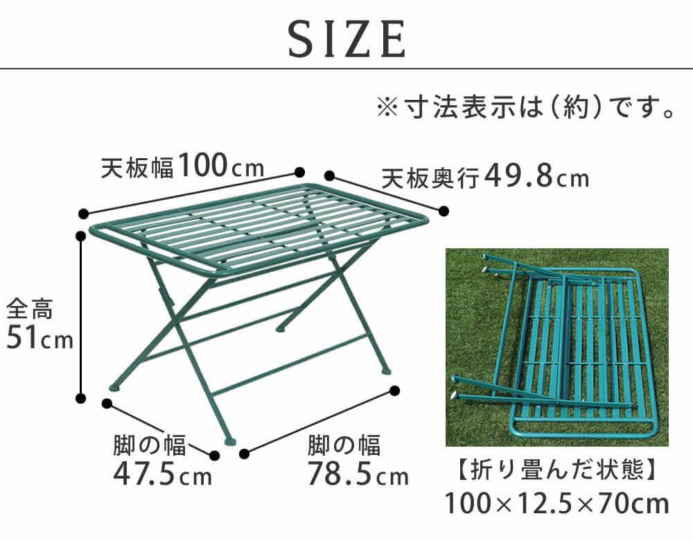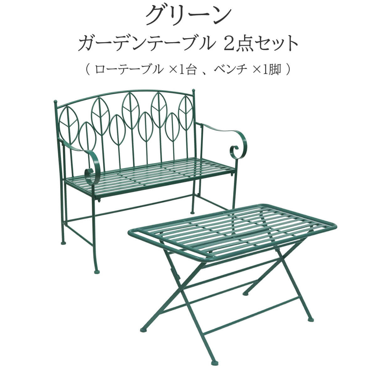ガーデンテーブルセット 合計2点セット ガーデンテーブル1台 ガーデンベンチ1脚 グリーン アイアンテーブル テーブル100cm幅 折り畳みテーブル アイアンベンチ 庭のベンチ 庭のテーブル 2人掛けベンチ アウトドアテーブル アウトドアベンチ おすすめ おしゃれ 北欧 モダン