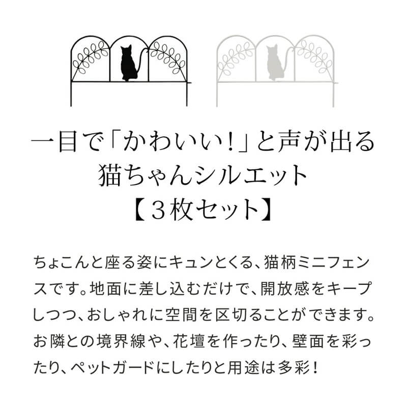 ミニフェンス ガーデンフェンス 3枚セット アイアンフェンス 同色3枚セット 花壇の間仕切り ガーデニング 間仕切り ブラック ホワイト 黒 白 猫 猫フェンス 猫デザインフェンス 目隠し おすすめ おしゃれ 北欧 モダン スタイリッシュ 庭の境界線 庭の間仕切り 花壇のフェンス 家庭菜園 花壇 ラティス トレリス ツタ バラ モッコウバラ クレマチス ジャスミン アイビー スイカズラ ハニーサックル ツルバラ ツルハナナス トケイソウ アケビ ハツユキカズラ フウセンカズラ アサガオ ミニフェンス ミニアイアンフェンス ミニガーデンフェンス