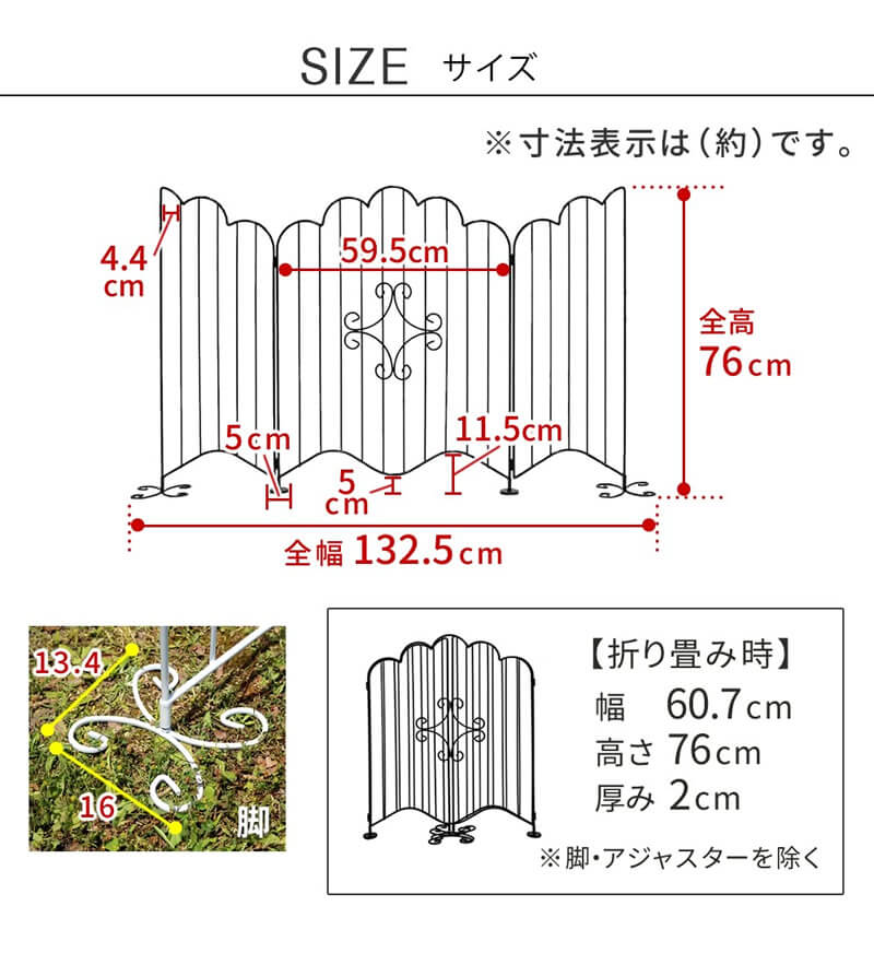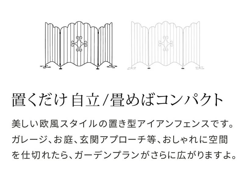 ガレージや庭、玄関アプローチなど、空間をおしゃれに仕切ることができる美しい北欧スタイルの置き型アイアンフェンスです。