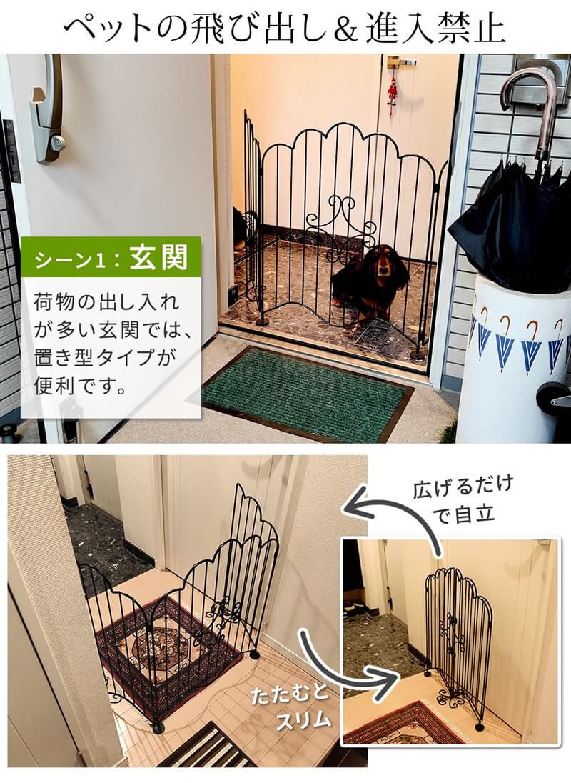 ガーデンフェンスゲートとしての使用はもちろん、屋内でも台所などでは、危険な調理器具から愛犬をやさしく通せんぼしたり、出入りが多い玄関でも活躍してくれる置き型アイアンフェンスです。