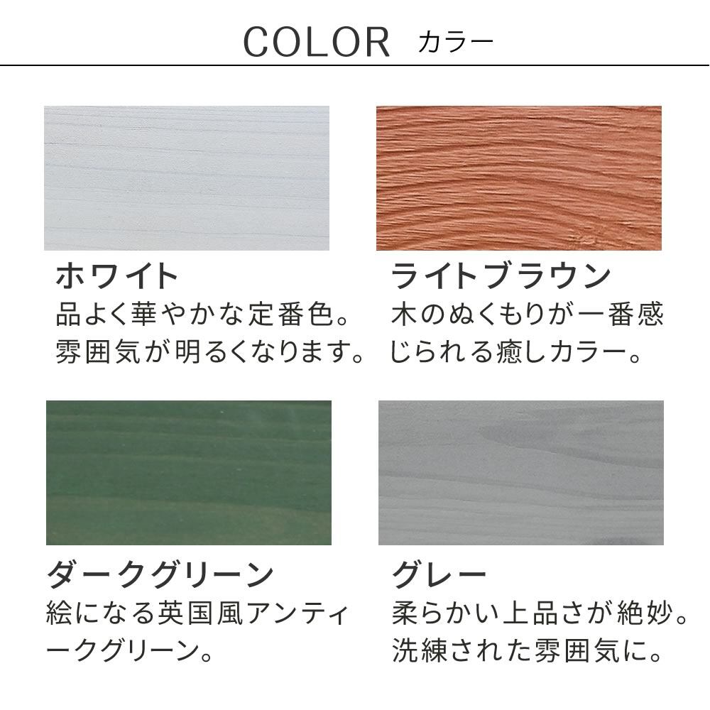 ■カラー:ダークグリーン、ライトブラウン、グレー、ホワイト(※ホワイトはステイン塗装による木目や地目が見えるウォッシュホワイト仕上げとなります。)