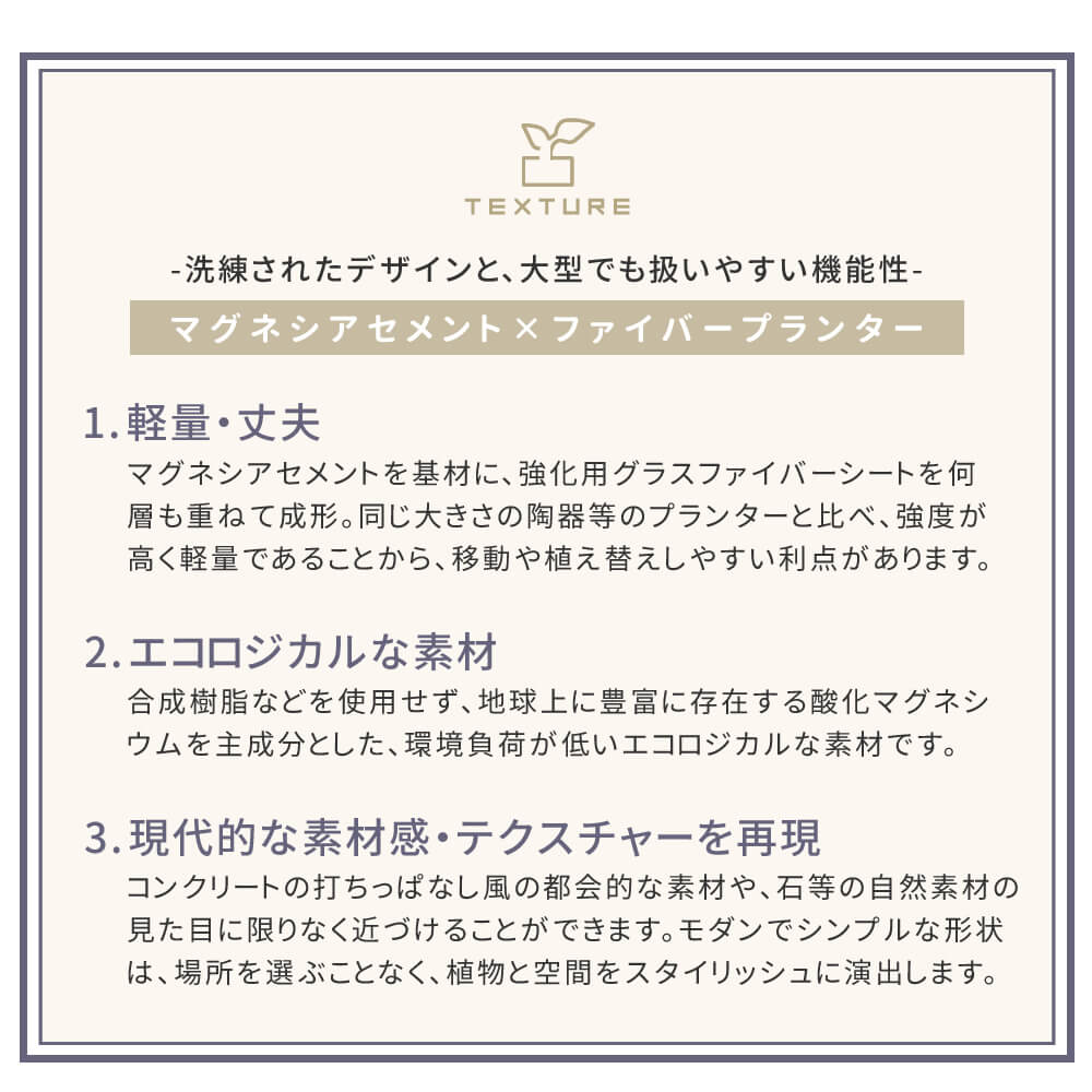 マグネシアセメントを基材に、強化用グラスファイバーシートを何層も重ねて成形しているので、同じ大きさの陶器等のプランターと比べ、強度が高く軽量であることから、移動や植え替えしやすい材質です。