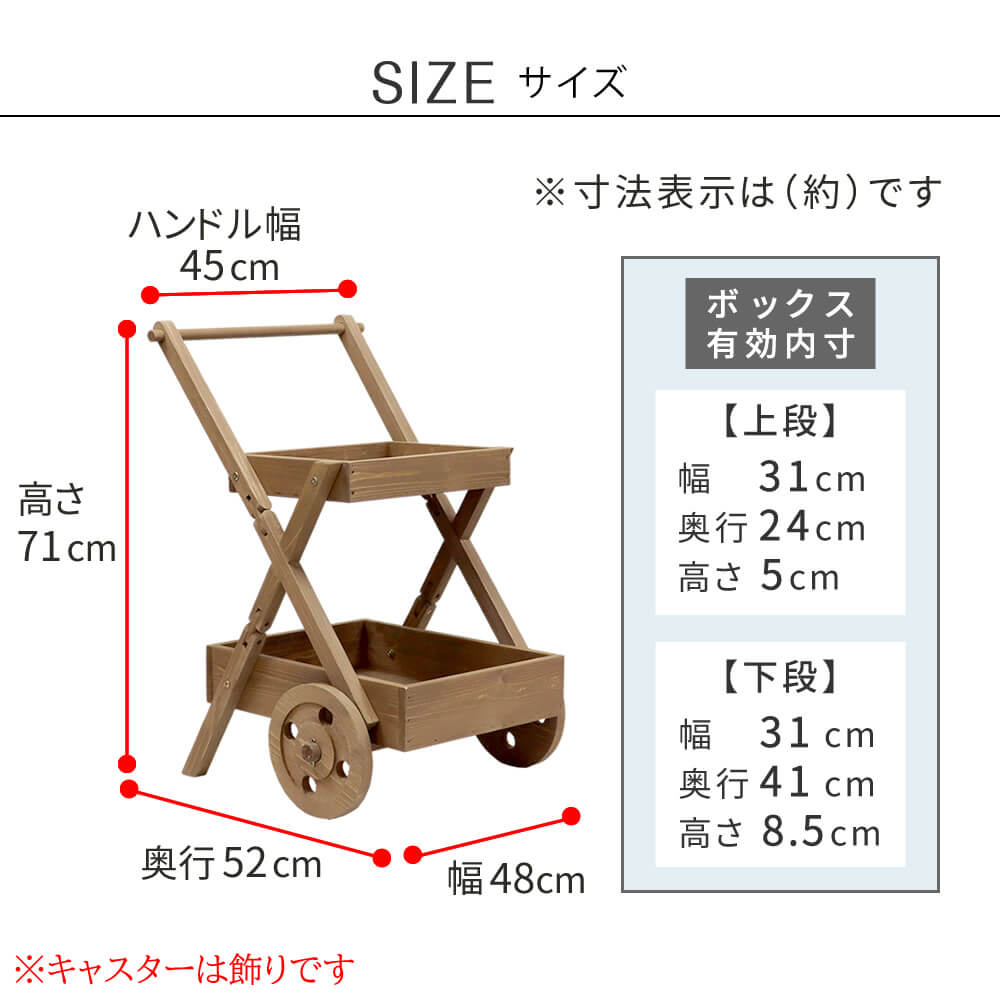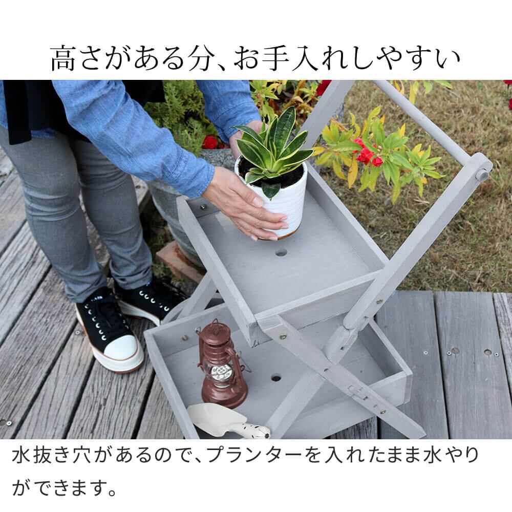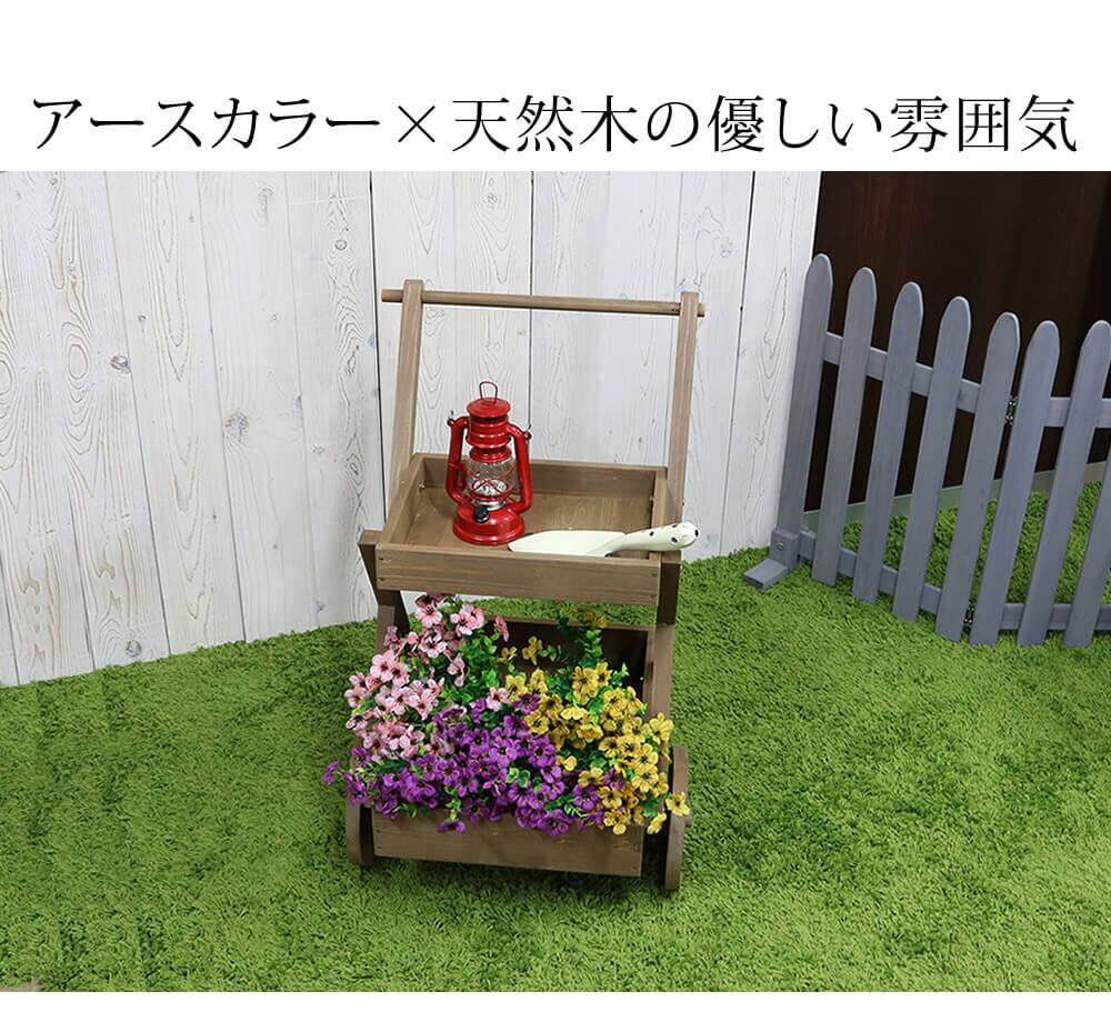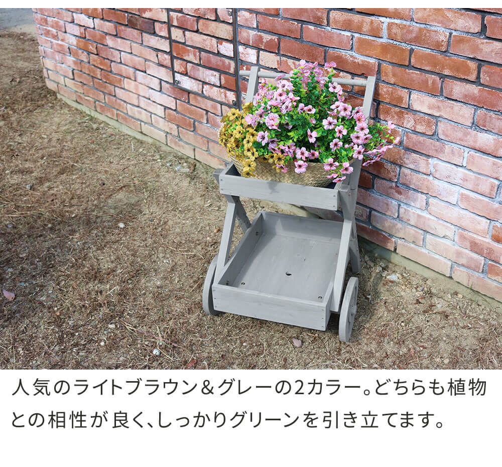 ワゴン型プランタースタンド 48cm幅 ライトブラウン グレー 花台 フラワーラック フラワースタンド プランター台 木製 幅48cm 奥行52cm 高さ71cm おすすめ おしゃれ 北欧 モダン スタイリッシュ ガーデン用品ラック 収納 収納ラック 木製ラック 水抜き穴付き プランター置き