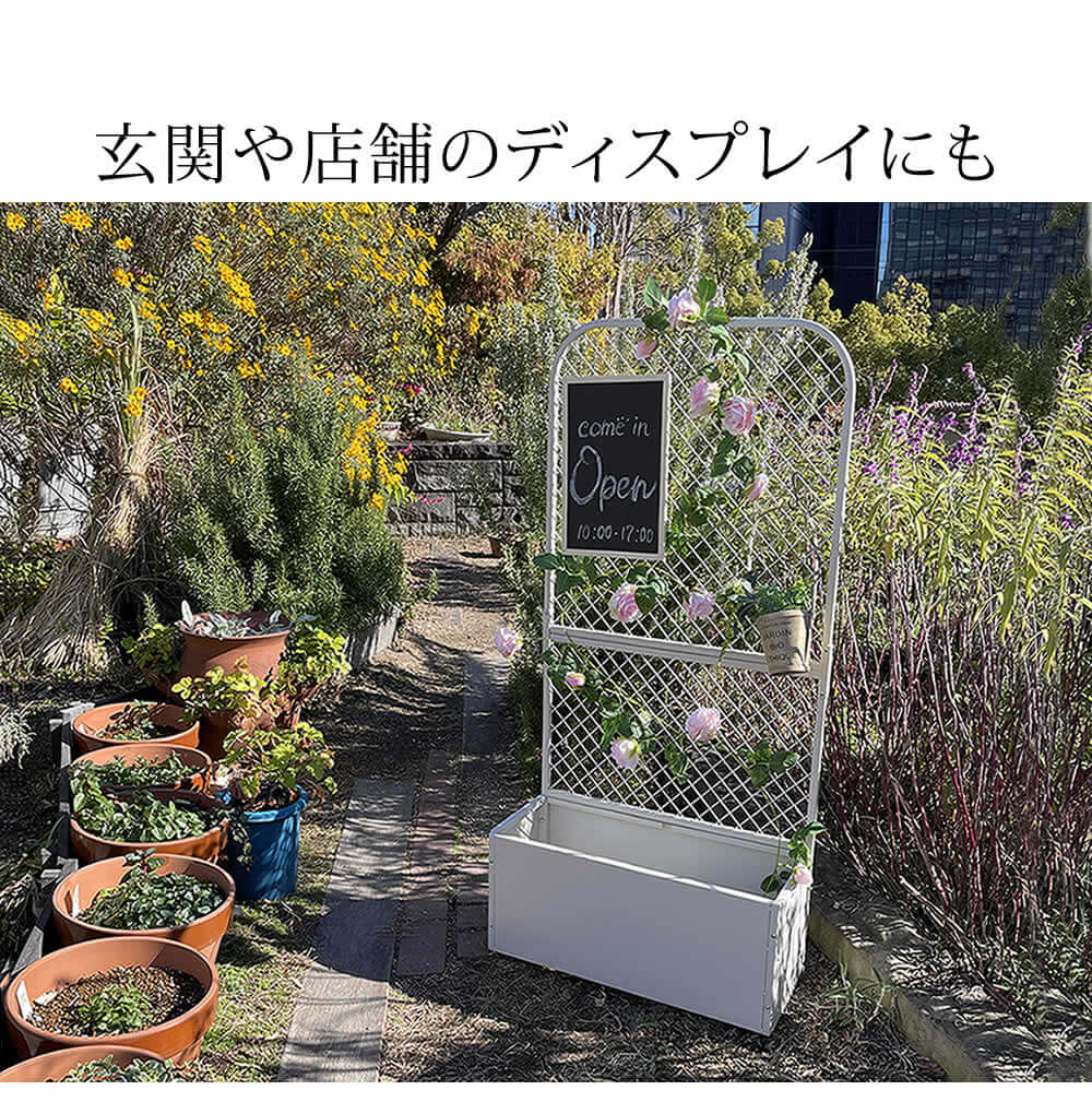 お部屋やベランダ、玄関等の限られた空間でも設置しやすく、プランターや鉢植えを入れることができるプランターボックス付きのアイアンフェンスです。