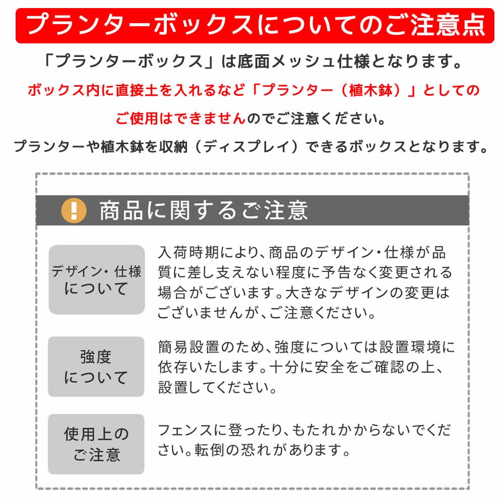 ・「プランターボックス」底面はメッシュ仕様となり、直接土を入れるなど、プランター(植木鉢)としてのご使用はできません。