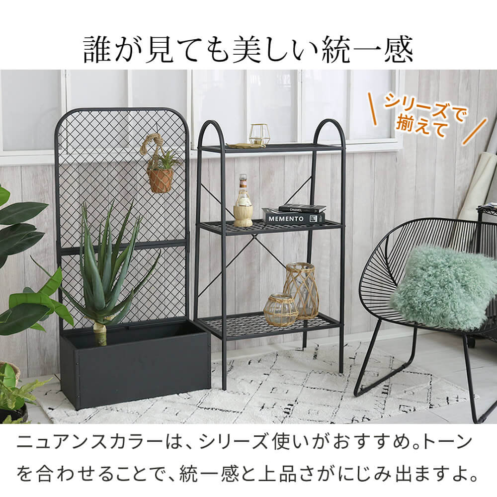 棚板は丈夫なアイアンメッシュ素材なので、プランターの日当たりや風通しを良くして、植物の成長をサポートします。
