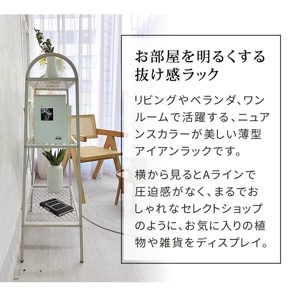 横から見るとAラインで圧迫感がなく、植物や雑貨をディスプレイできる61cm幅の薄型アイアンラックです。