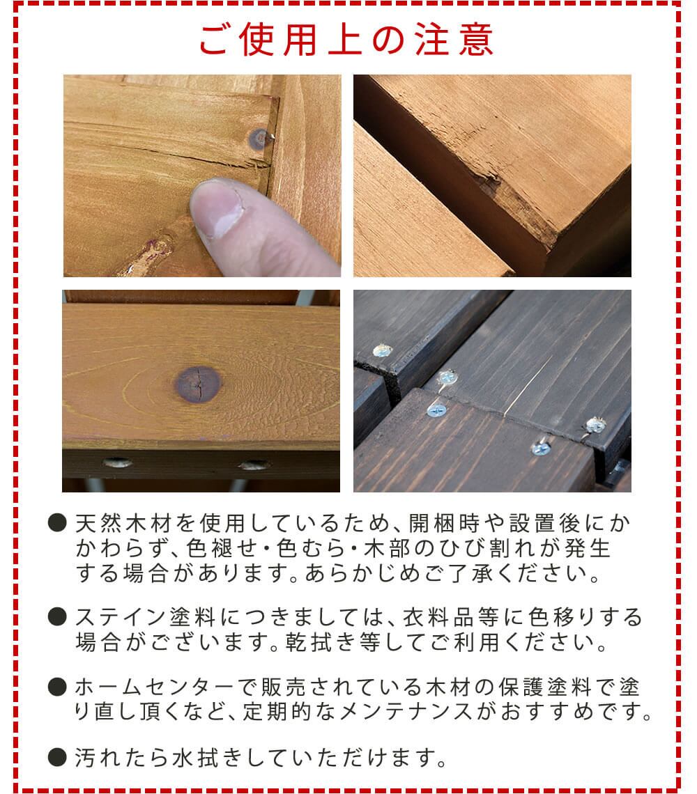 ・天然木材を使用しているため、開梱時や設置後にかかわらず、色褪せ・色むら・木部のひび割れが発生する場合があります。あらかじめご了承ください。