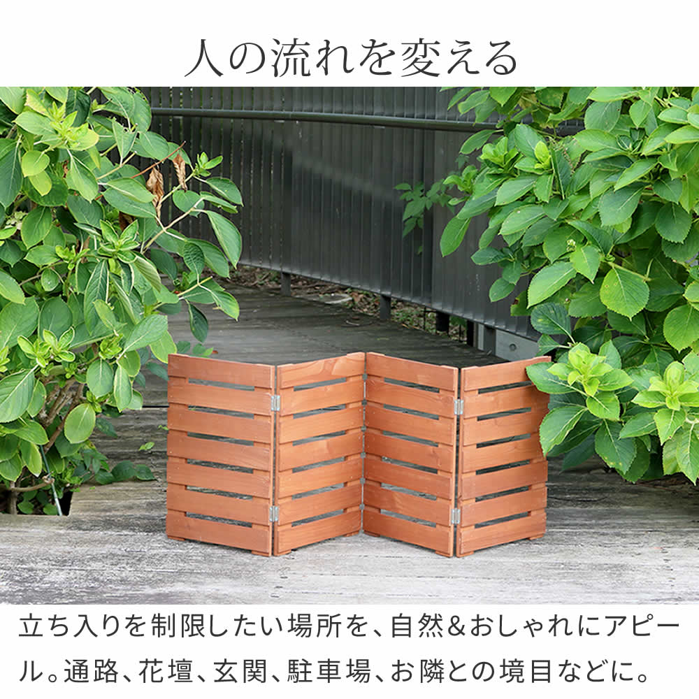 立ち入りを制限したい場所などに設置するのはもちろん、通路、花壇、玄関、駐車場、お隣との境目などにも設置しやすいウッドフェンスです。