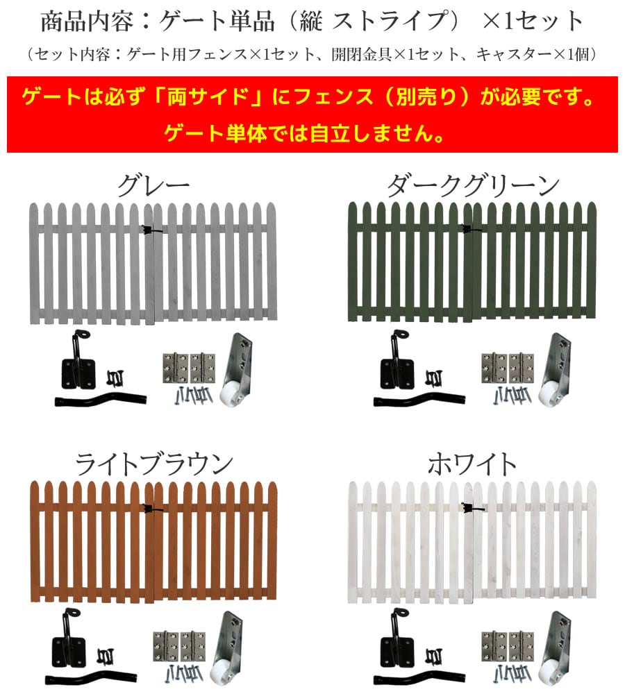 ・ゲートは必ず「両サイドにフェンス(別売り)」が必要です。ゲートセット単体では自立しませんのでご注意ください。