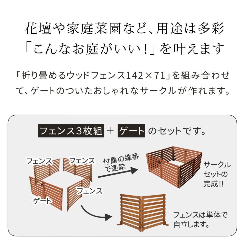 ゲートのついたおしゃれなフェンスサークルを作ることができるウッドフェンス3枚と、ゲート1セットがセットになった、サークルフェンスセットです。
