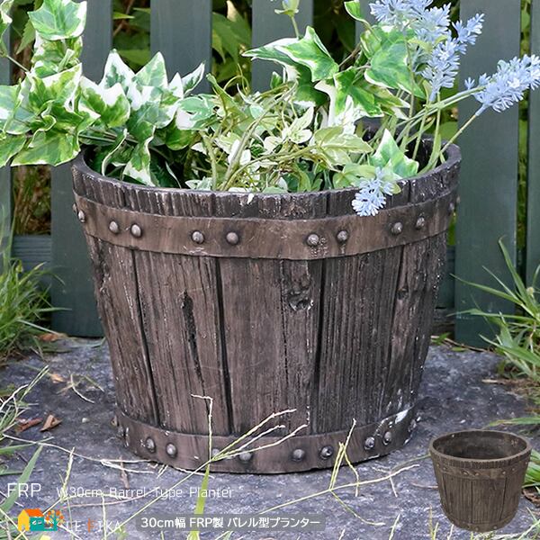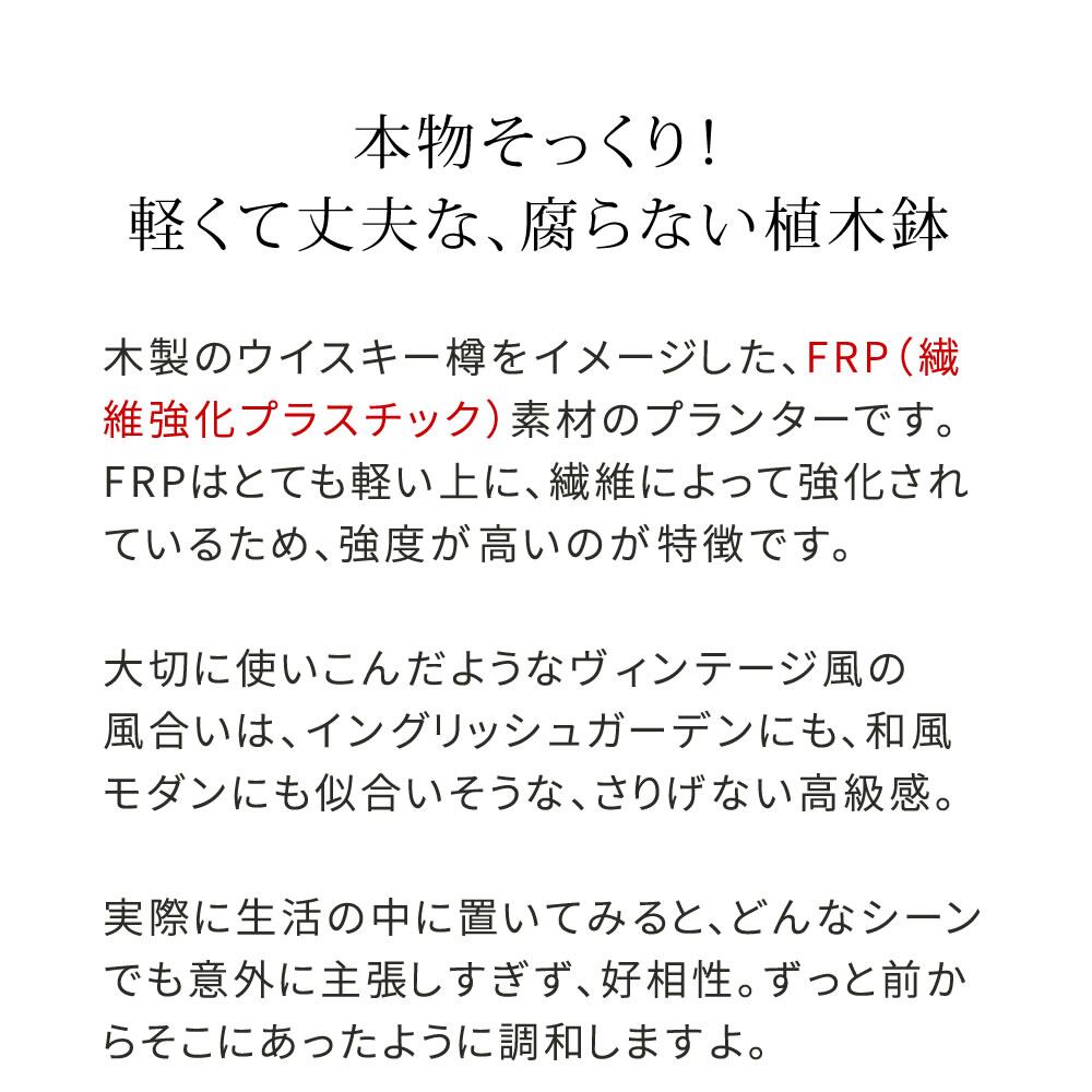 軽くて丈夫で腐らないFRP素材(繊維強化プラスチック)を使用したバレル型プランターです。