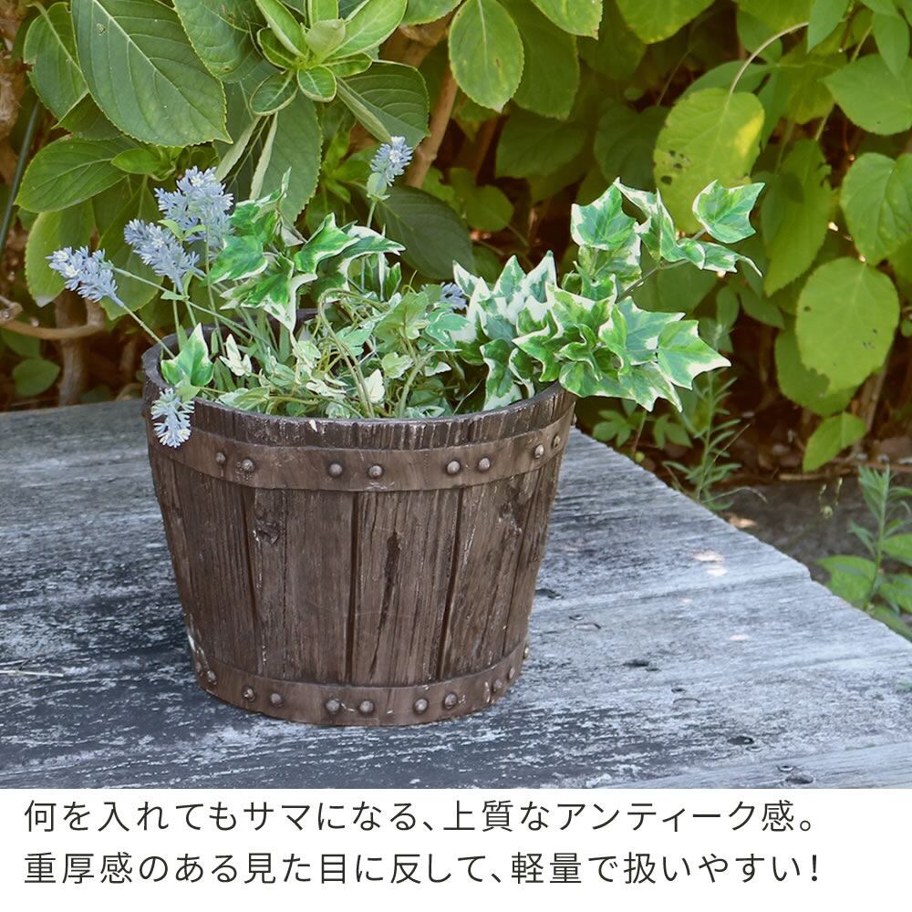 ウイスキー樽のようなおしゃれなデザインとヴィンテージ風の風合いがおしゃれなプランターです。
