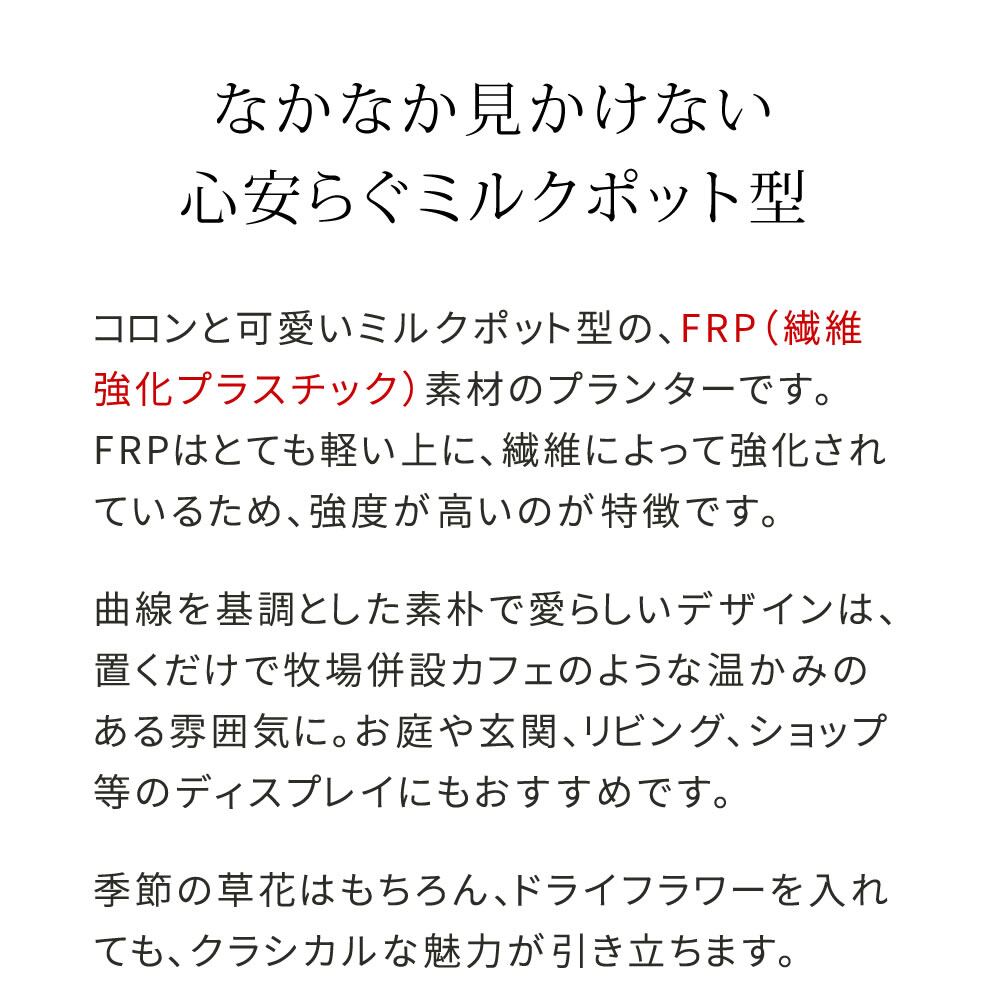 軽くて丈夫で腐らないFRP素材(繊維強化プラスチック)を使用したミルクポット型プランターです。