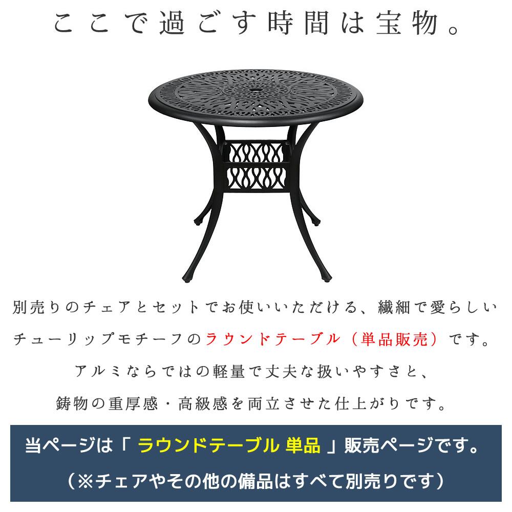 繊細で愛らしいチューリップモチーフの90cm幅ガーデンラウンドテーブル1台単品です。