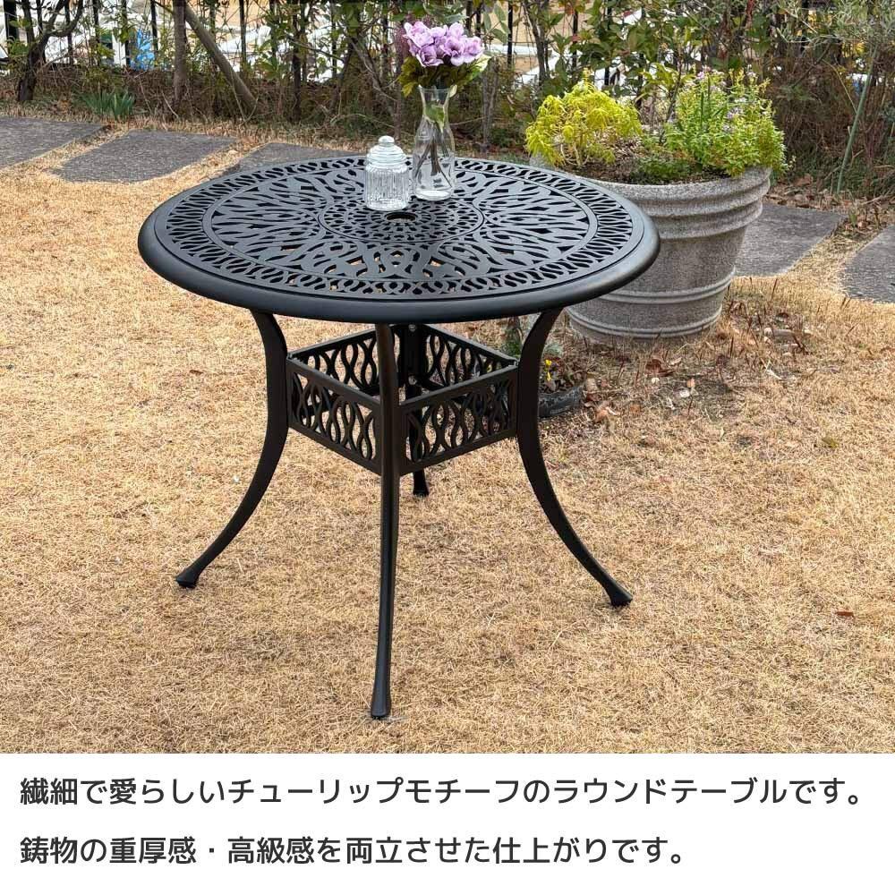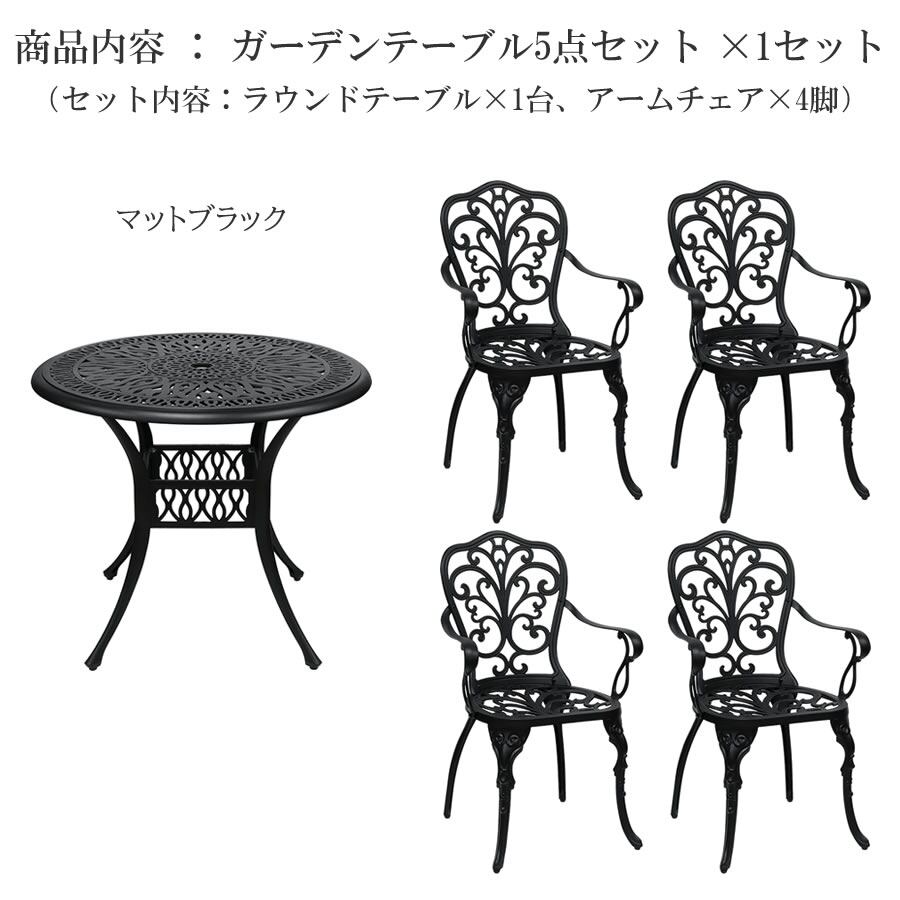 ガーデンテーブルチェア5点セット ラウンドテーブル1台 アームチェア4脚 合計5点セット マットブラック アルミ製 庭の机 庭の椅子 ガーデンテーブル ガーデンチェア 丸テーブル 鋳物 おすすめ おしゃれ 北欧 モダン クラシック 庭のテーブルセット テーブル90cm幅 机 椅子