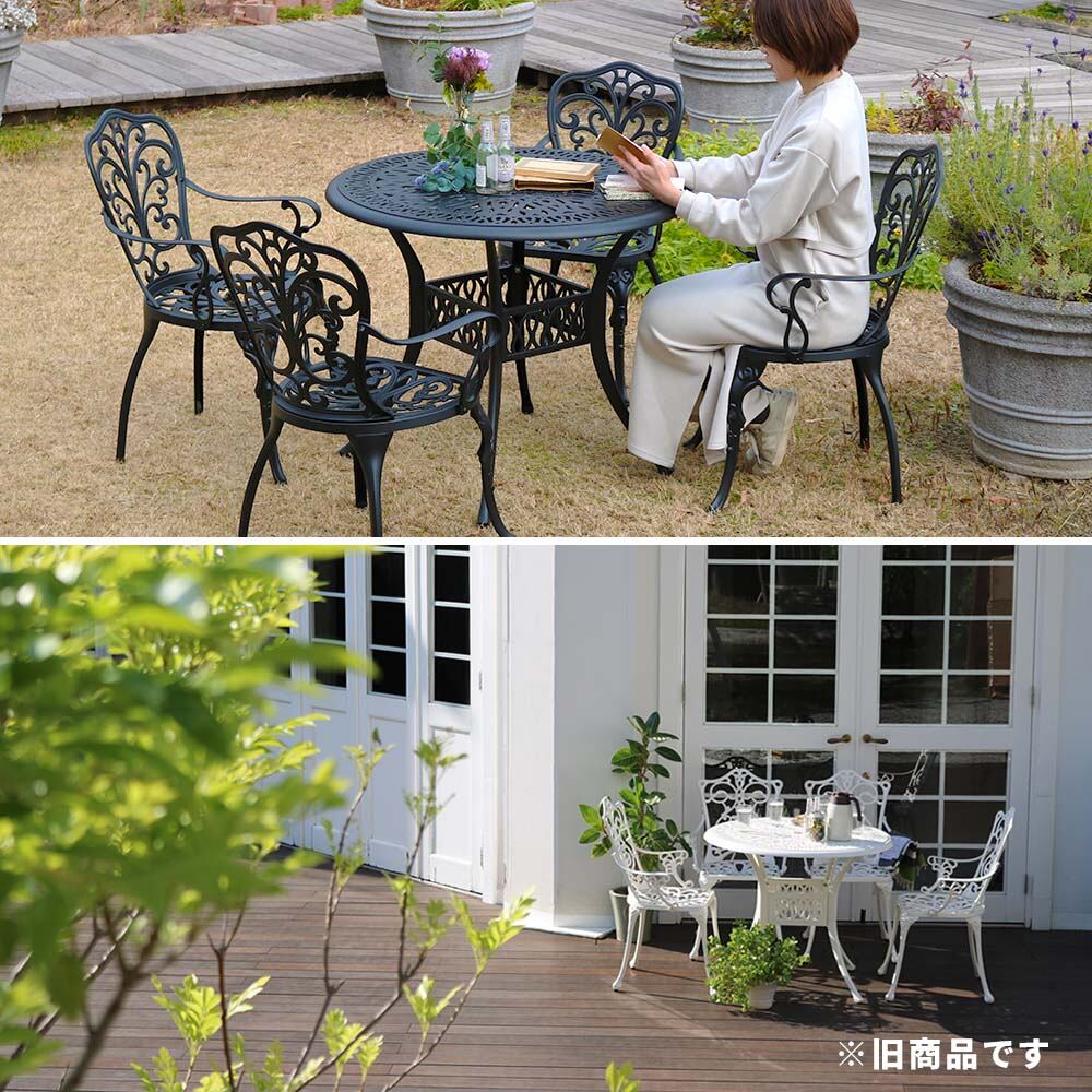 アルミならではの軽量で丈夫な扱いやすさと、鋳物の重厚感と高級感を両立させたラウンドテーブル1台と、アームチェア4脚、合計5点がセットになったガーデンテーブルチェアセットです。