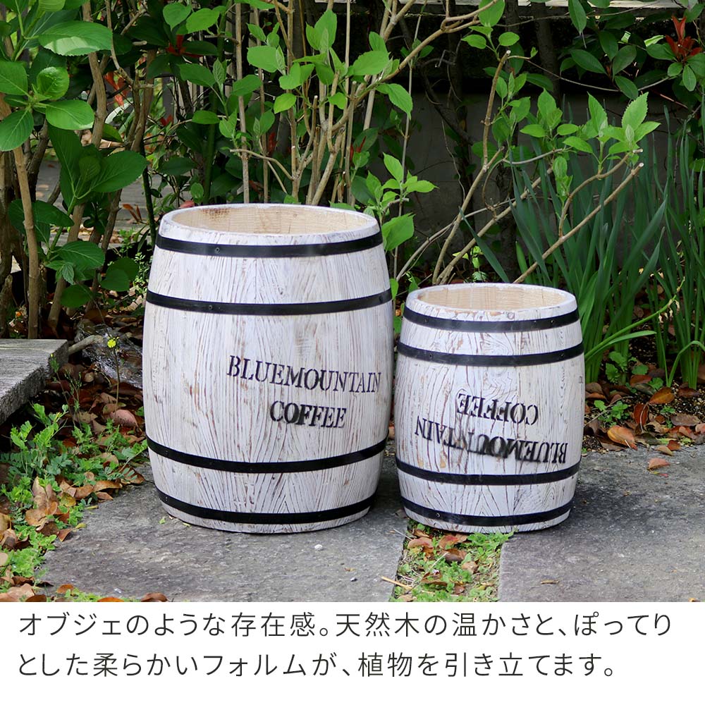 木製プランター 大小セット ホワイト 木製 天然木 コーヒーバレル型 プランタースタンド 木製プランタースタンド アンティーク調 おすすめ おしゃれ 北欧 モダン スタイリッシュ ディスプレイ 傘立て スリッパ入れ ステンシルロゴ プランタースタンド ガーデンプランター 庭 庭のプランター 園芸 菜園 家庭菜園 庭園 花壇 水抜き穴付き 樽型プランター ベランダ バルコニー テラス ウッドプランター