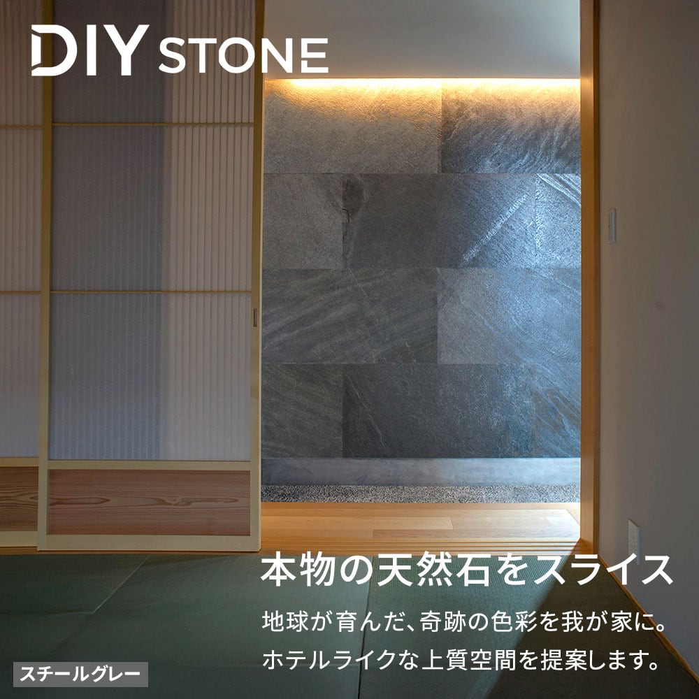施工は、市販の石材用接着剤で貼り付けていただき、1枚が大きいので重厚感と高級感も圧倒的な天然石タイルです。