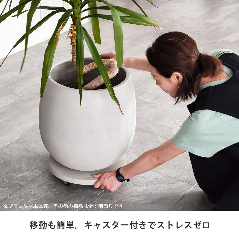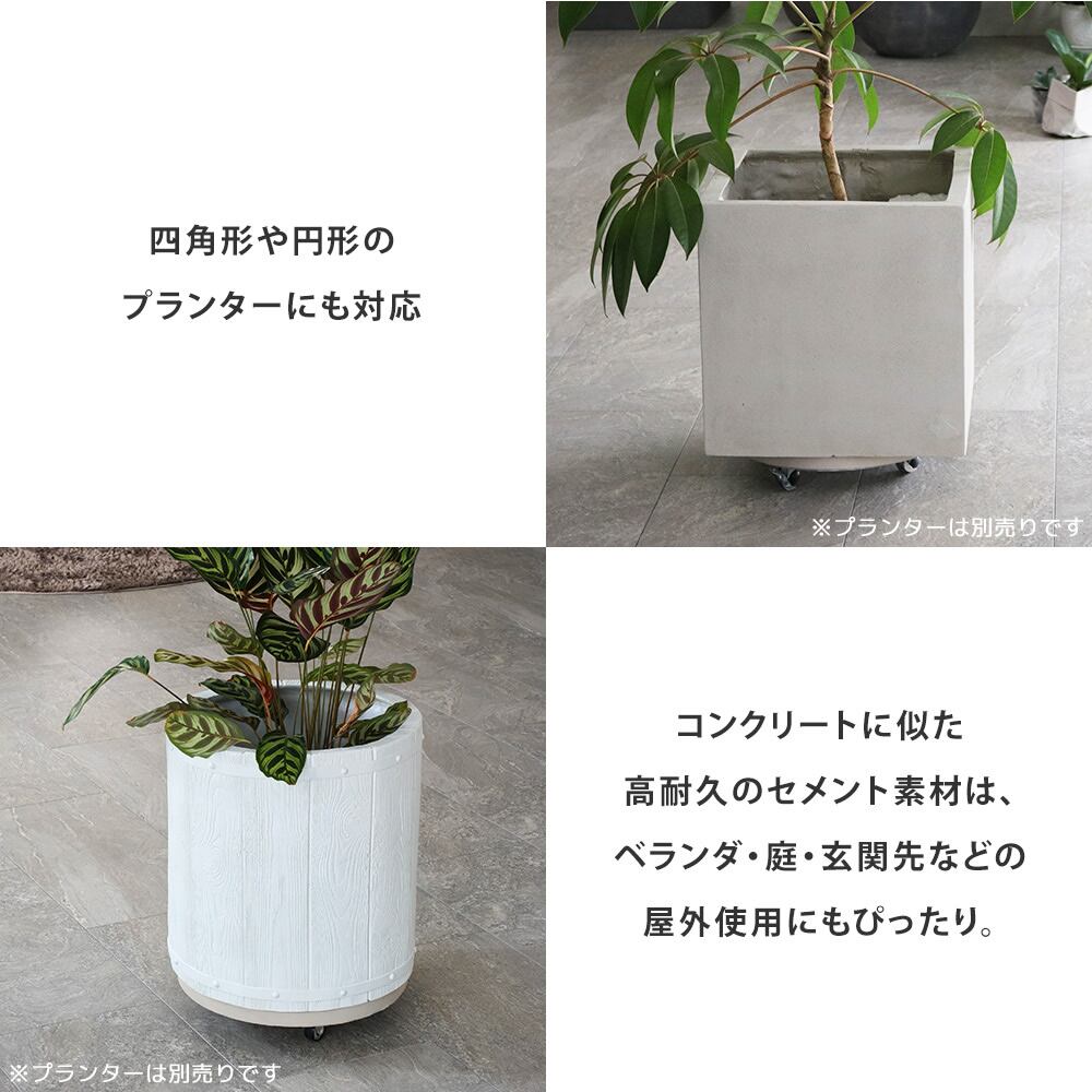 セメントならではの重厚な質感が、植物の美しさを引き立ててくれる36cm幅のキャスター付き丸型プランターキャリーです。
