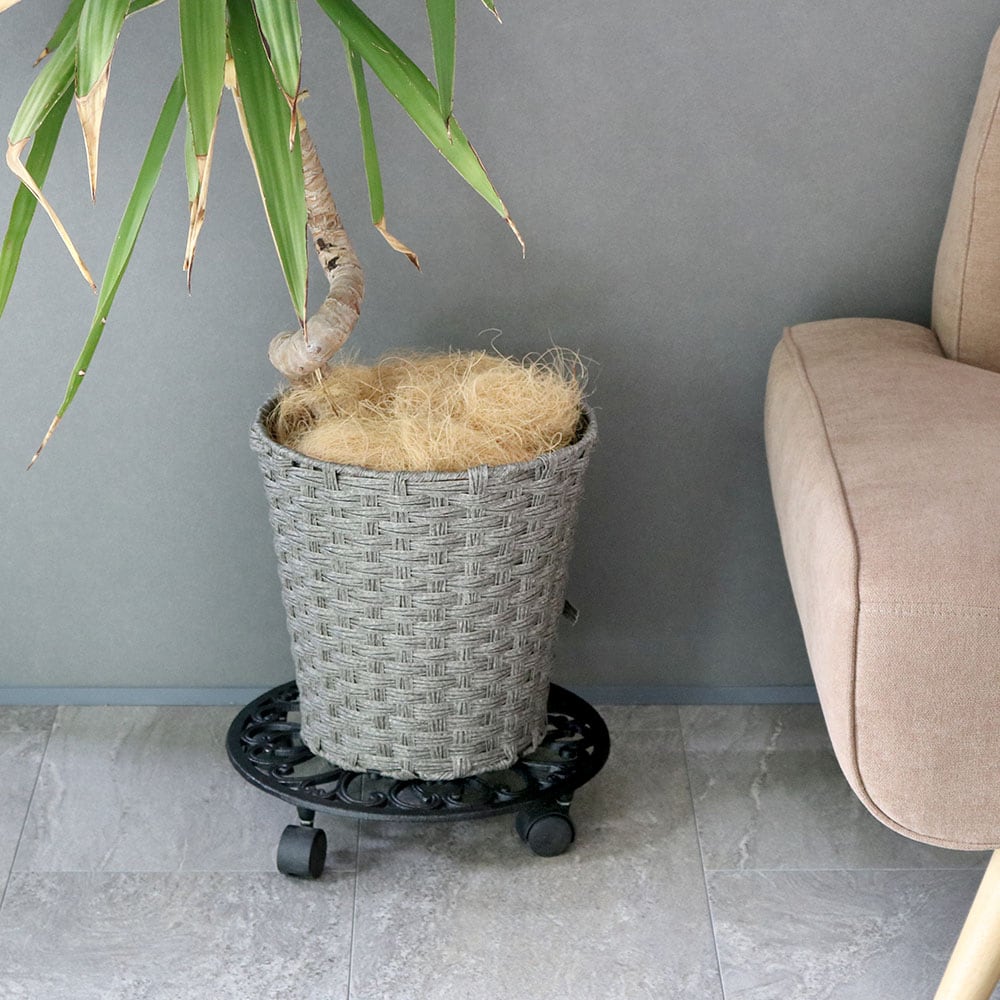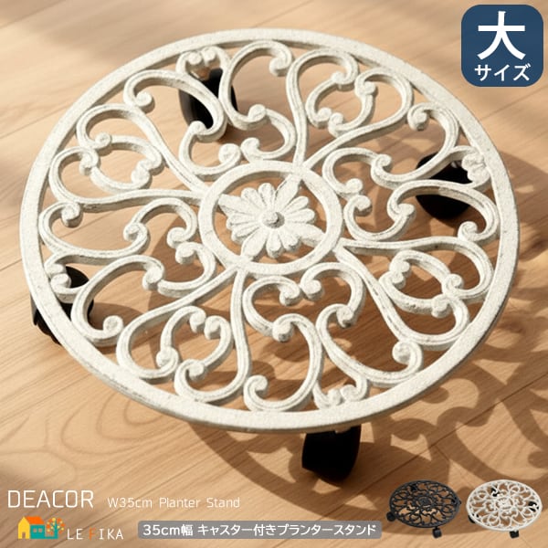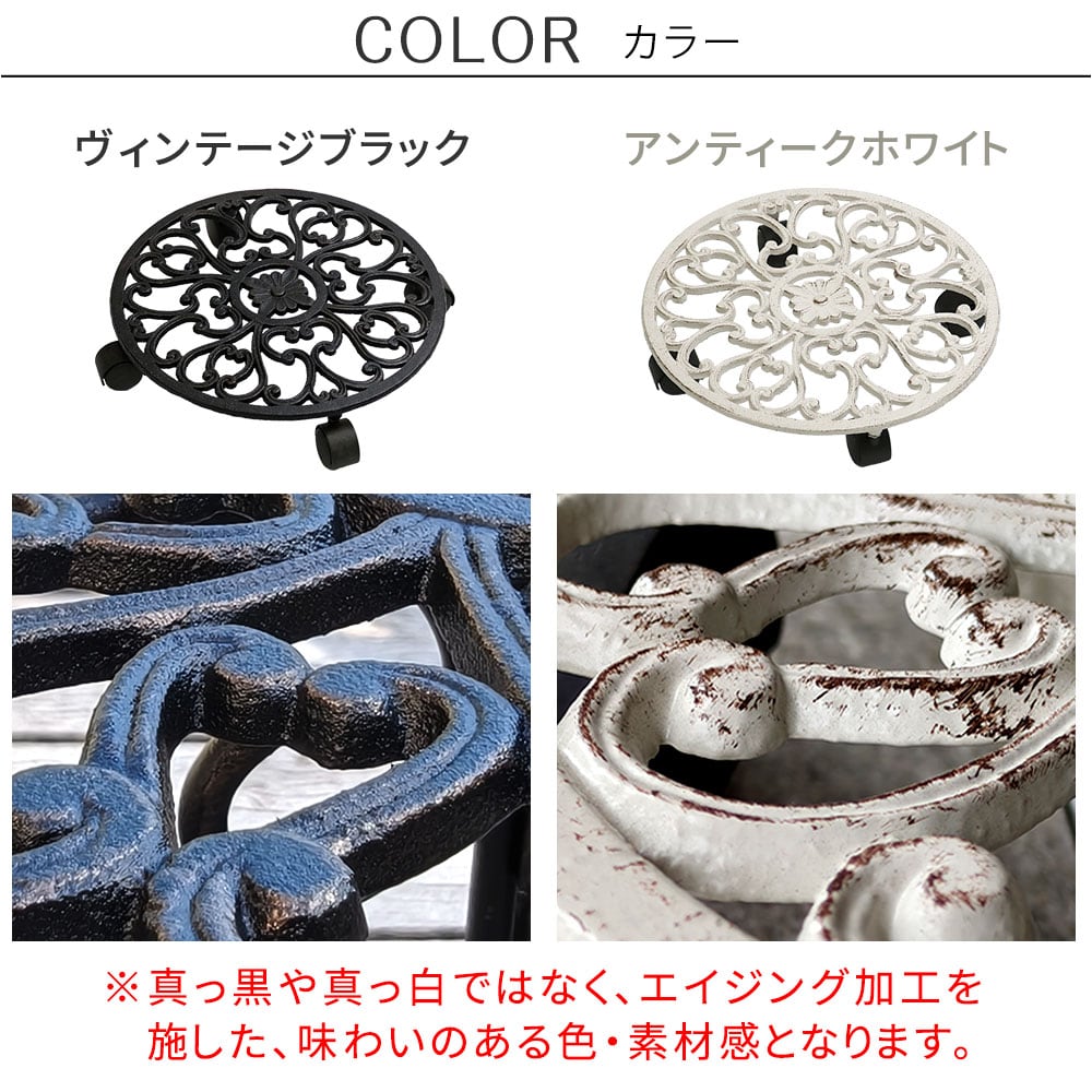 アンティーク調の模様と、エイジング塗装が美しい置いておくだけでも存在感のある35cm幅のキャスター付き丸型プランタースタンド(大サイズ)1台単品です。