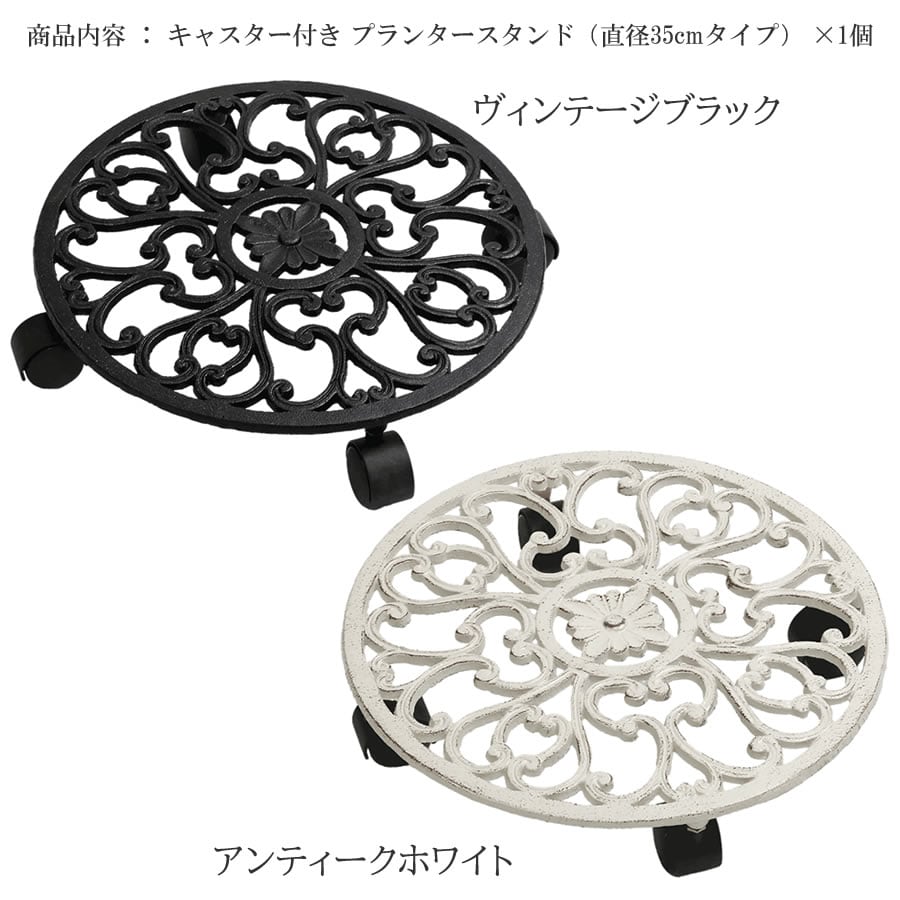 プランタースタンド 35cm幅 大サイズ 1台単品 ヴィンテージブラック アンティークホワイト 花台 フラワースタンド おすすめ おしゃれ モダン スタイリッシュ キャスター付き キャスター付きプランタースタンド プランター台 キャスター付きフラワースタンド アイアン 庭 ベランダ バルコニー 花壇 テラス 玄関 DIY ガーデニング プランター置き 植木鉢スタンド 鉢植えスタンド 植木鉢台 鉢植え台 丸形 丸型 円形 円型 丸型プランター台 円型花台