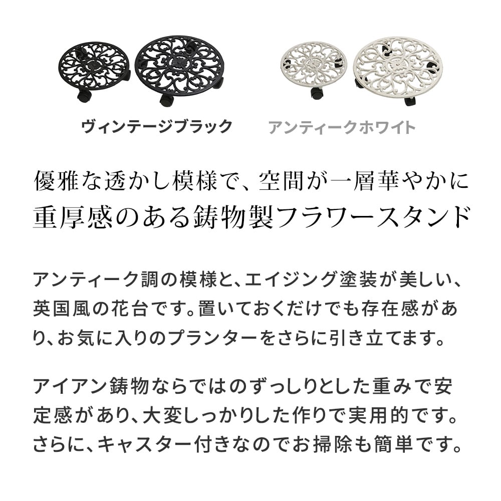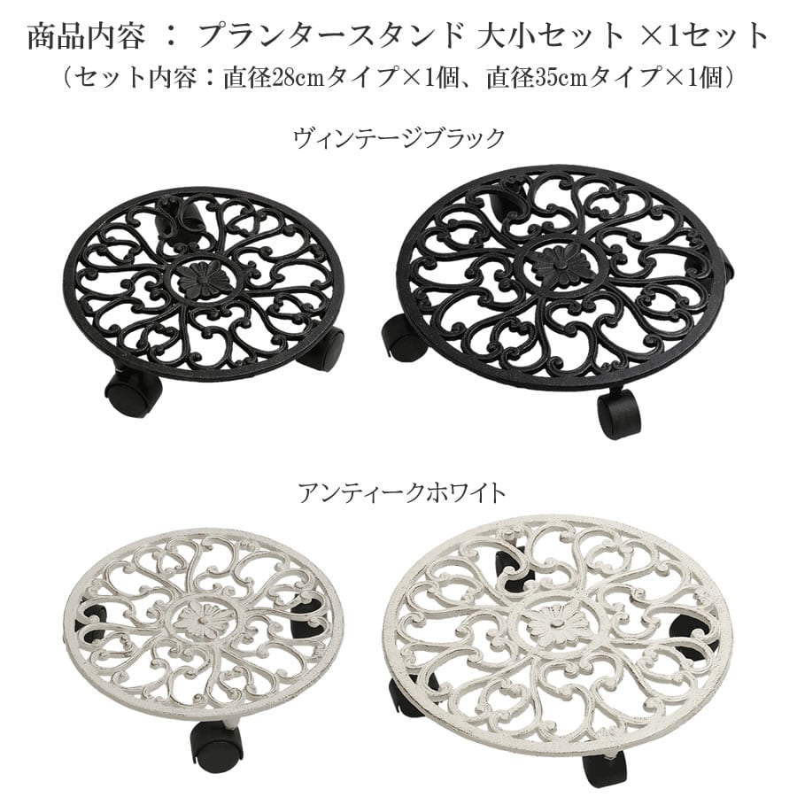 プランタースタンド 大小セット 27.5cm幅 小サイズ 35cm幅 大サイズ 同色2点セット ヴィンテージブラック アンティークホワイト 同色2個セット 同色2台組 花台 フラワースタンド おすすめ おしゃれ モダン スタイリッシュ キャスター付き キャスター付きプランタースタンド プランター台 キャスター付きフラワースタンド アイアン 庭 ベランダ バルコニー 花壇 テラス 玄関 DIY ガーデニング プランター置き 植木鉢スタンド 鉢植えスタンド 植木鉢台 鉢植え台 丸形 丸型 円形 円型 丸型プランター台 円型花台