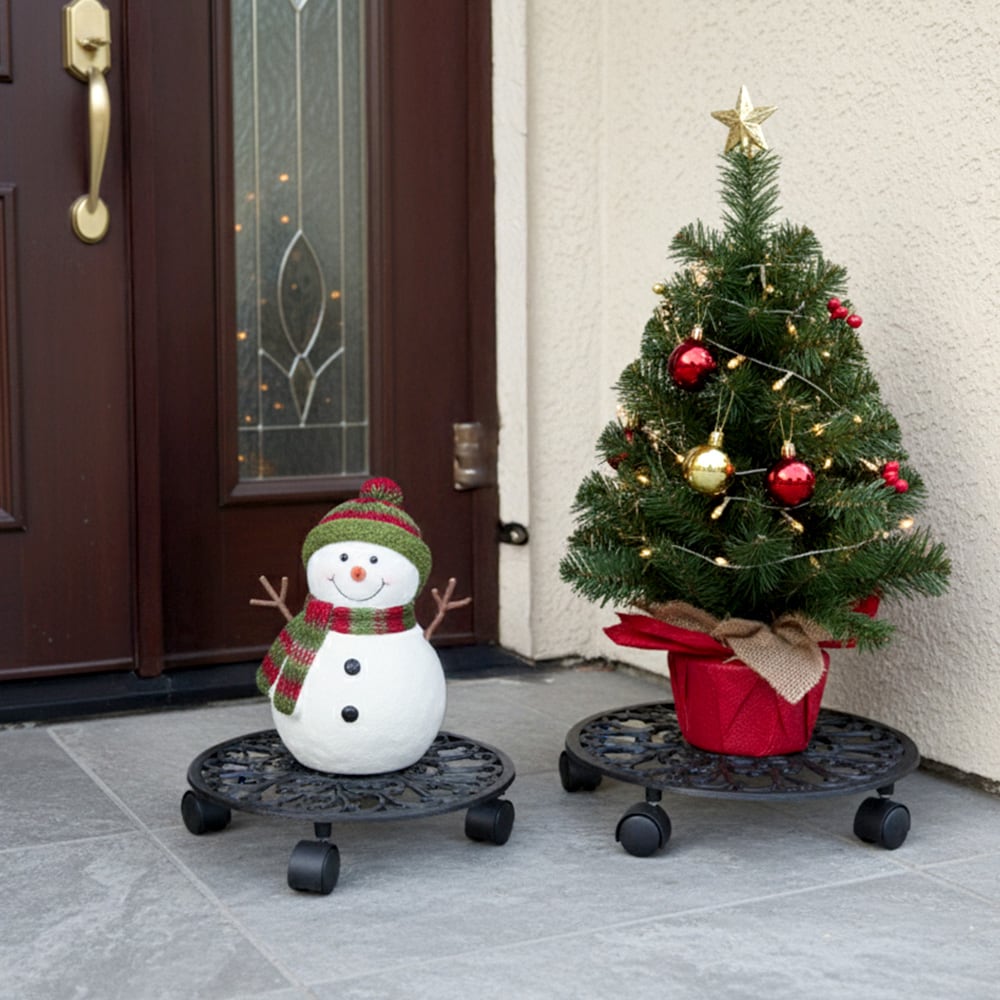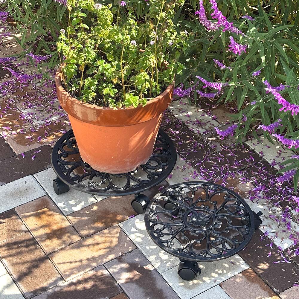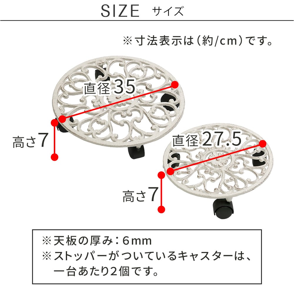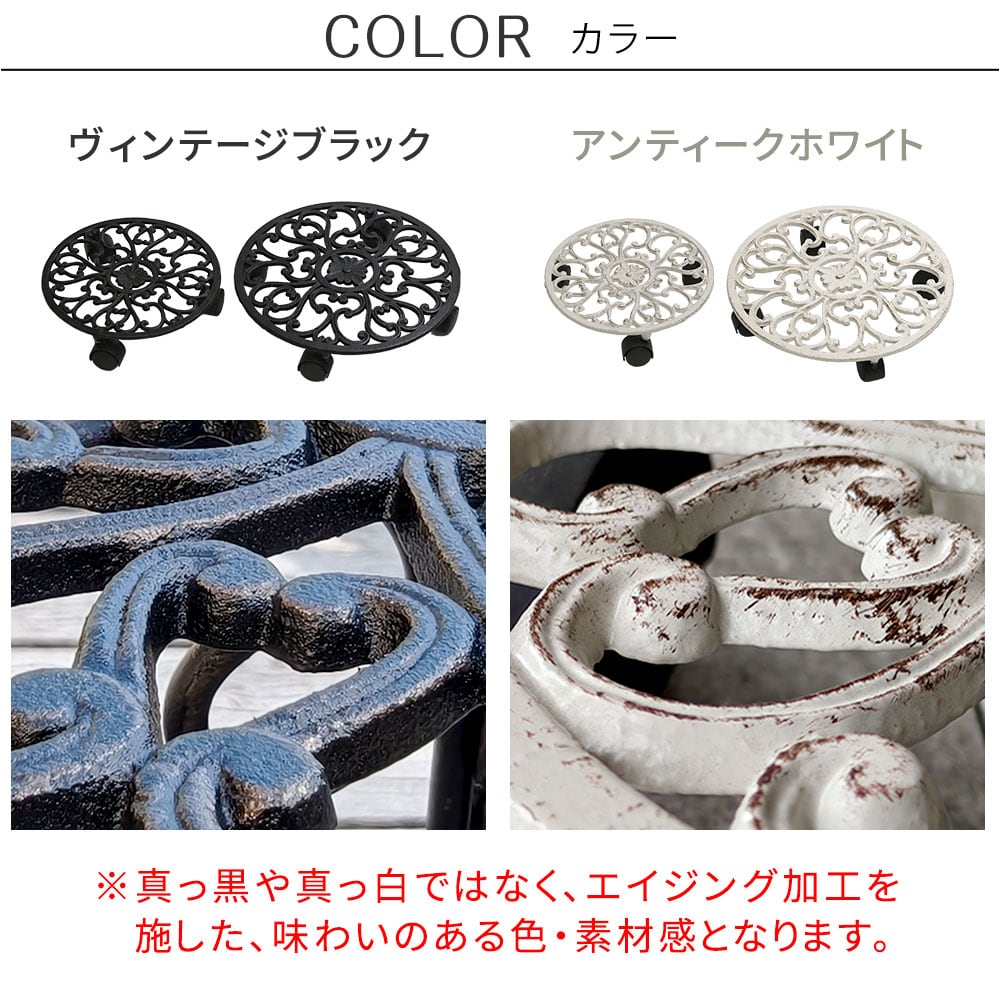 アンティーク調の模様と、エイジング塗装が美しい置いておくだけでも存在感のある、小サイズ(27.5cm幅)1台と大サイズ(35cm幅)1台がセットになったキャスター付き丸型プランタースタンド大小セットです。
