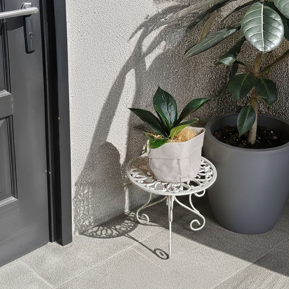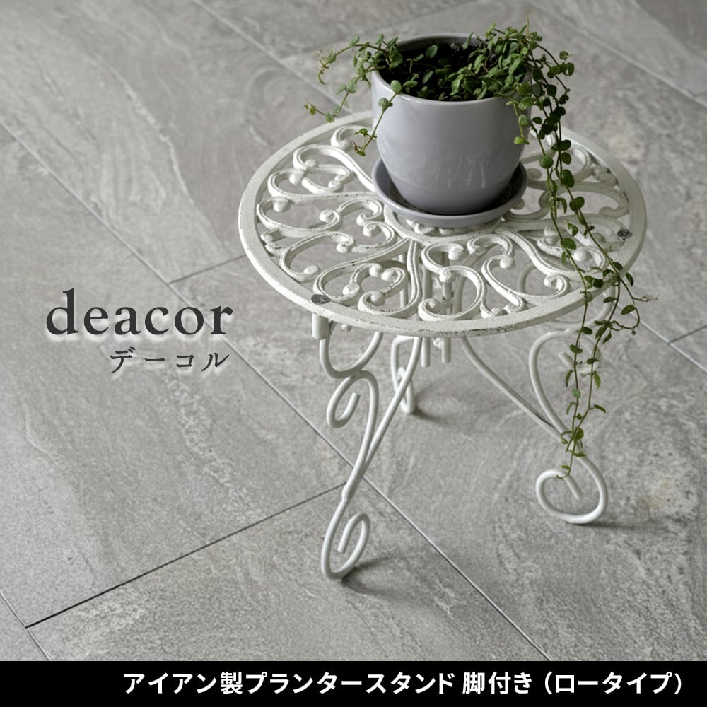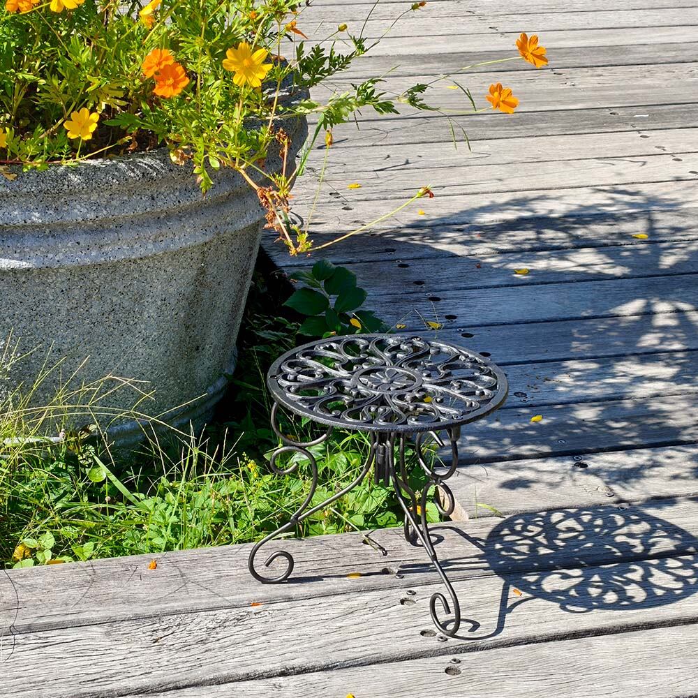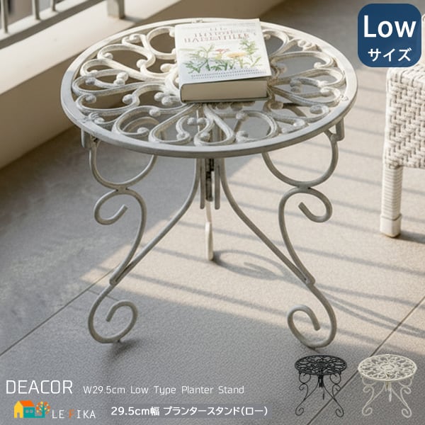繊細な模様が施された天板と、エレガントな曲線が描く脚部が美しい置いておくだけでも存在感のある29.5cm幅の丸型のプランタースタンド(ロータイプ)1台単品です。