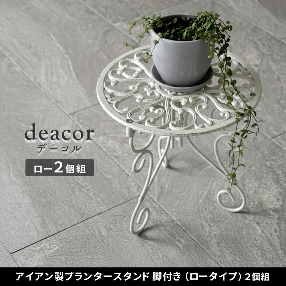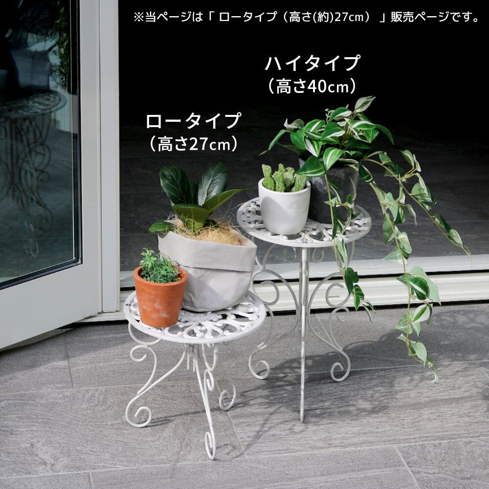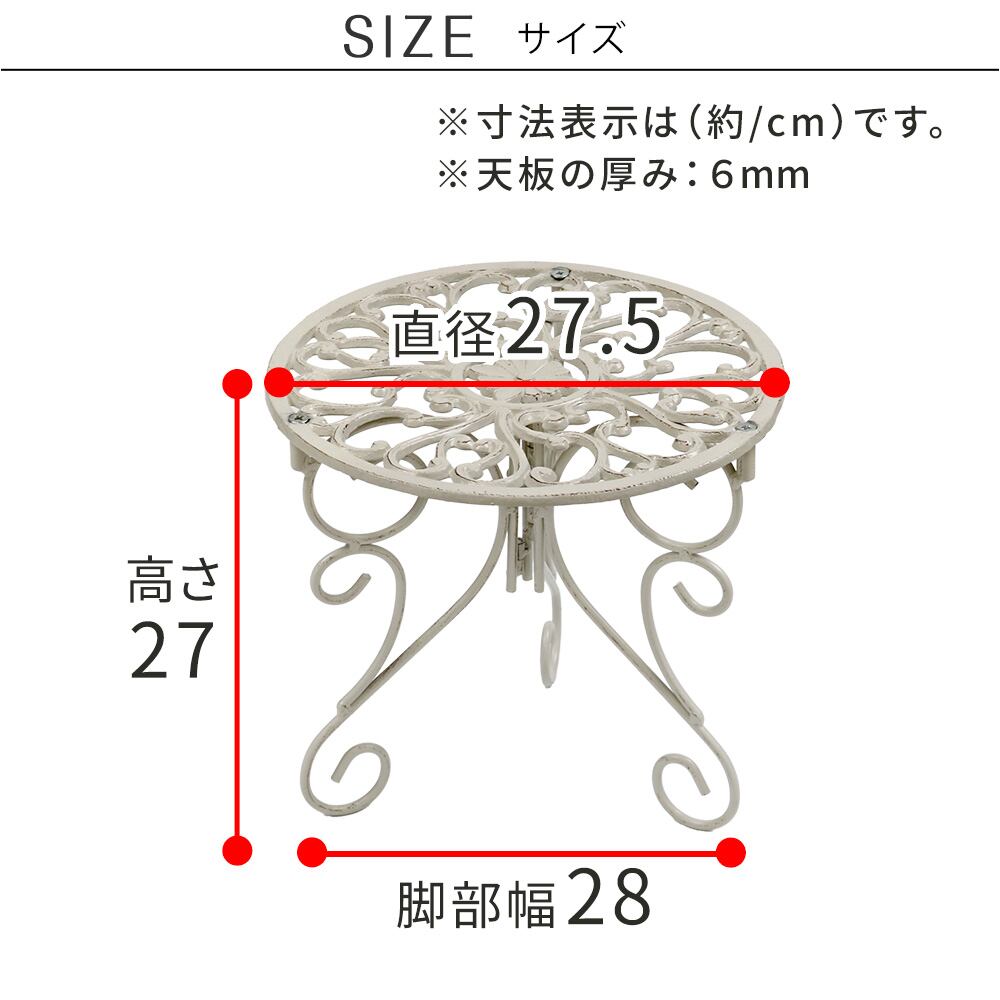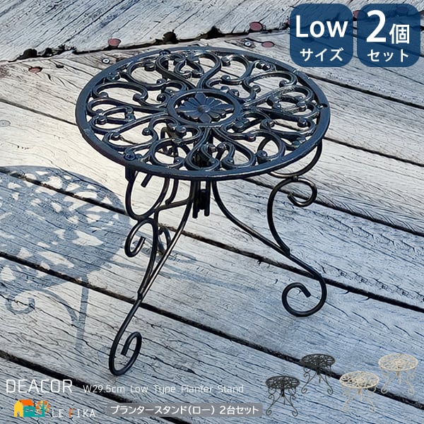 繊細な模様が施された天板と、エレガントな曲線が描く脚部が美しい置いておくだけでも存在感のある29.5cm幅の丸型のプランタースタンド(ロータイプ)同色2台セットです。