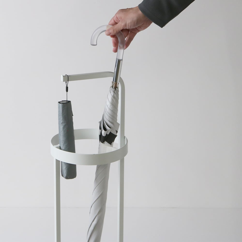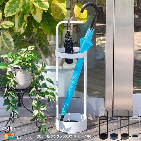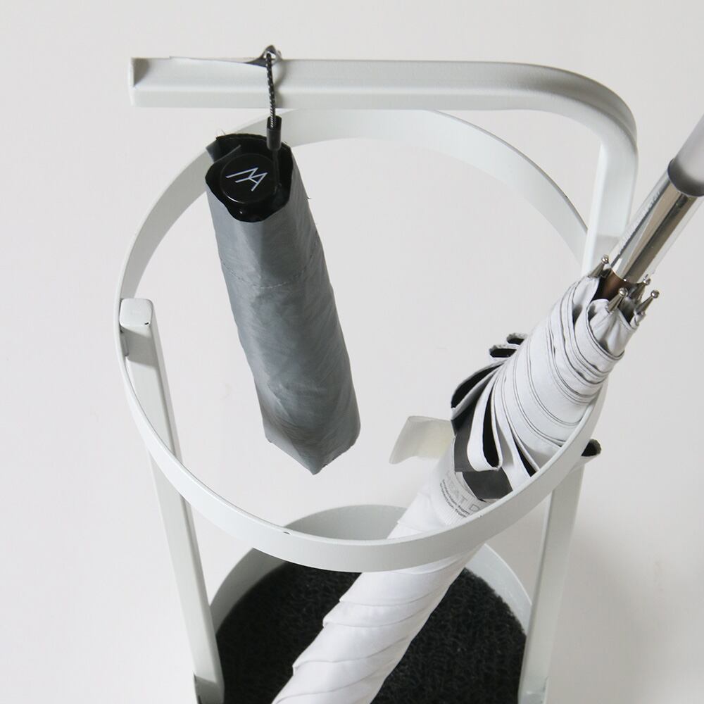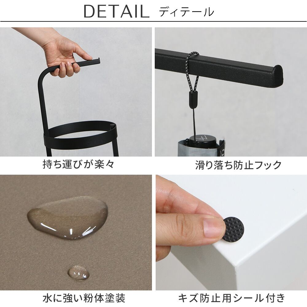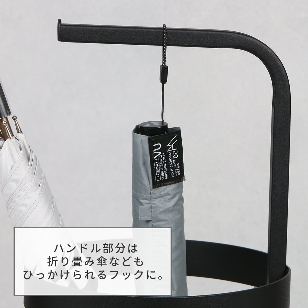 ハンドル部分は折り畳み傘などもひっかけられるフックデザイン仕様の20cm幅のサークルタイプの傘スタンドです。