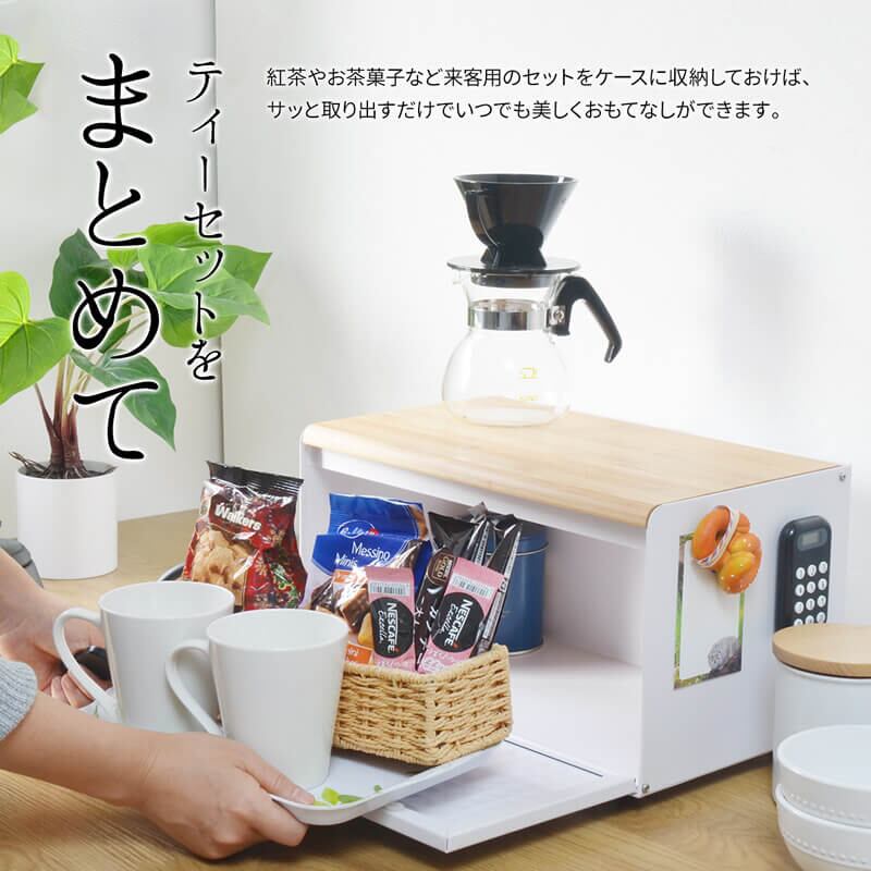 前面の扉と天板が開くので出し入れしやすく、生活感のあふれる雑貨をまとめて収納できてキッチンにおしゃれですっきりとした印象を与えます。