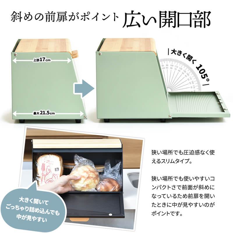 雑然としがちなパンやお菓子、調味料などを収納できるシンプルでスリムなブレッドケースです。