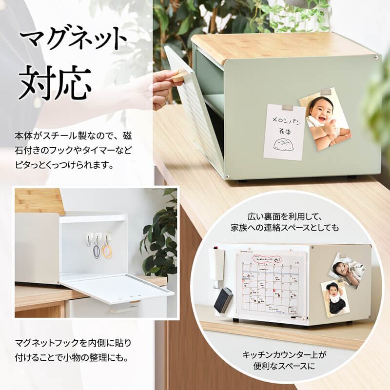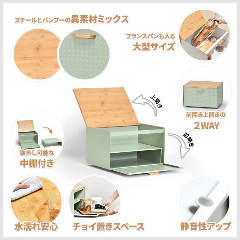 ブレッドケース 中棚付き 収納棚付き キッチン収納 収納ボックス 収納箱 おすすめ おしゃれ 北欧 ブラック ホワイト ライトグリーン 黒 白 緑 完成品 調味料収納 前開き 上開き 両開き エンボス加工 モダン 食べ物収納 食品収納 キッチン収納ボックス 棚付きブレッドケース 棚取外し可能
