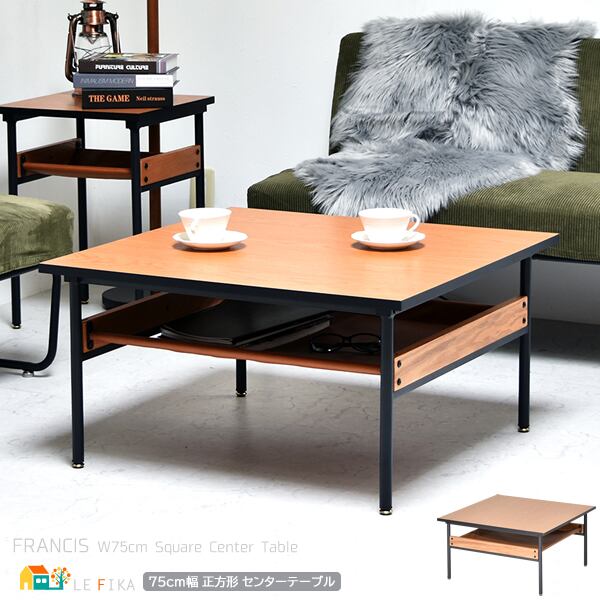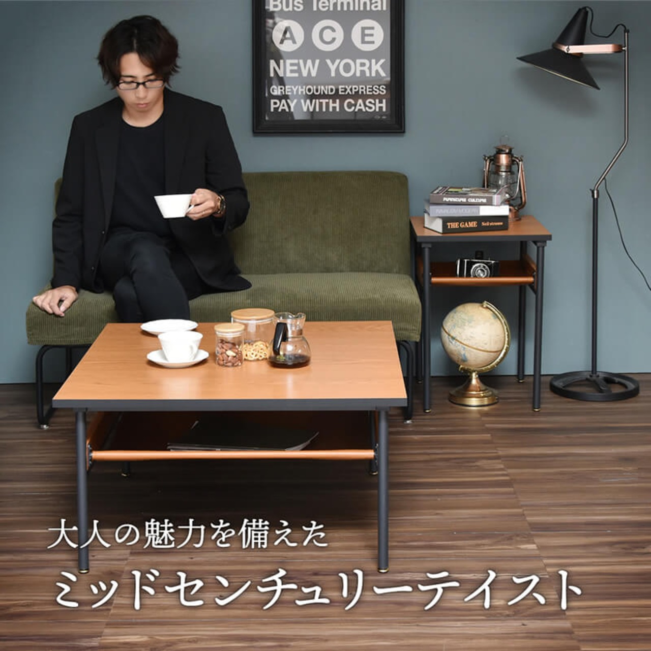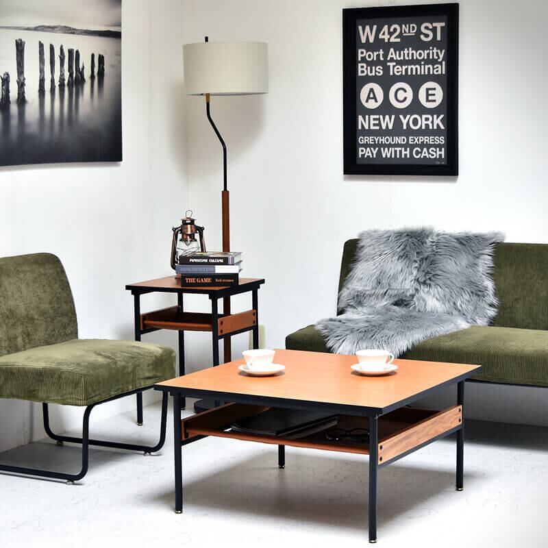 マットなパウダー塗装のブラックのパイプがミッドセンチュリーの空気感を醸し出す75cm幅の正方形のセンターテーブルです。