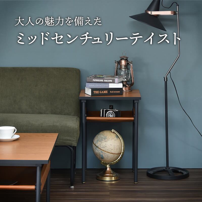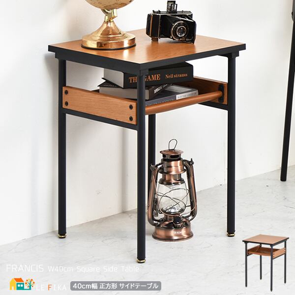 マットなパウダー塗装のブラックのパイプフレームがミッドセンチュリーの空気感を醸し出す40cm幅の正方形のサイドテーブルです。