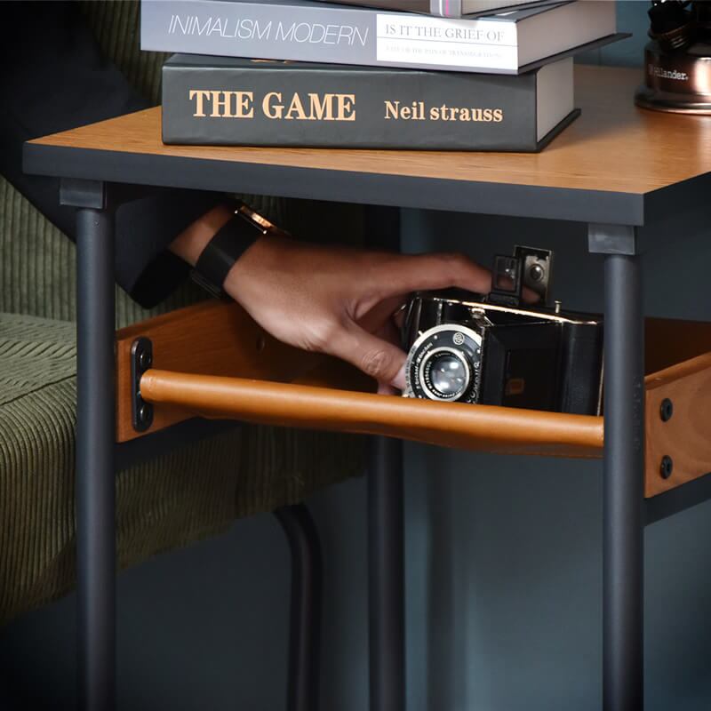 さらにPVCレザーを天板下のストレージに配した色味、質感、手触り、どれもが革新的な組み合わせの正方形型サイドテーブルです。