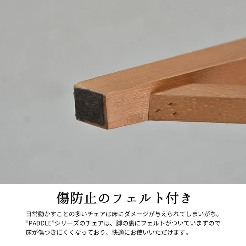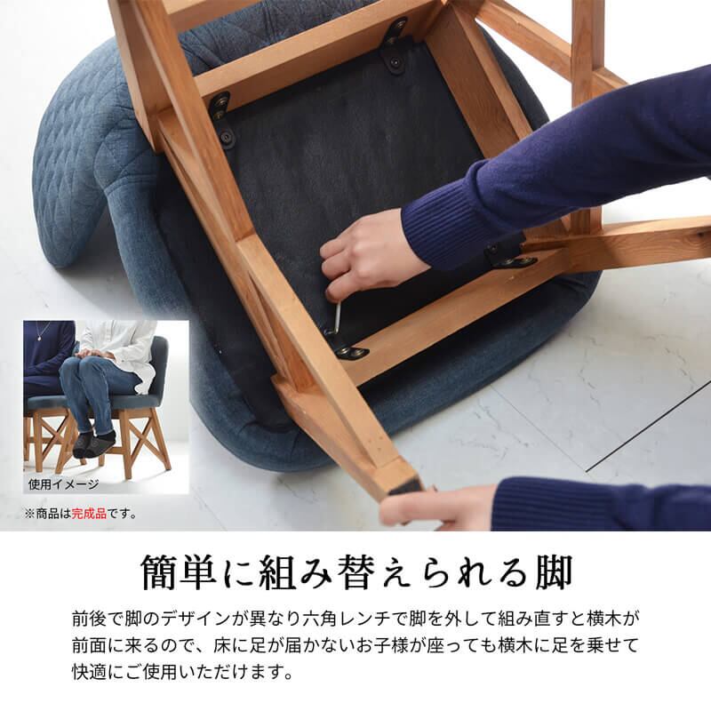 脚は前後でデザインが異なり、付属のレンチで組み換え横木を前に持ってくることで床に足の届きにくいお子様も快適に使用可能なダイニングチェアです。