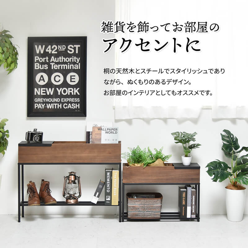 ボックス状の収納に観葉植物などを飾ることができ、飲み物や本などちょっとした小物を置くことができるスライドトレー付きの80cm幅の収納ボックスサイドテーブルです。