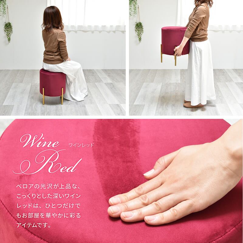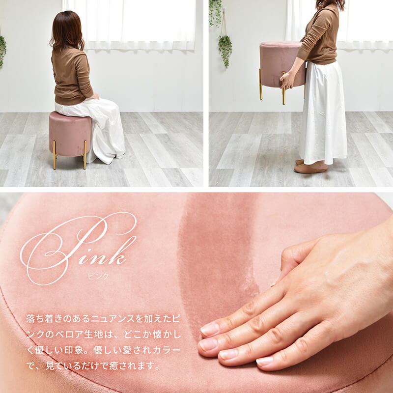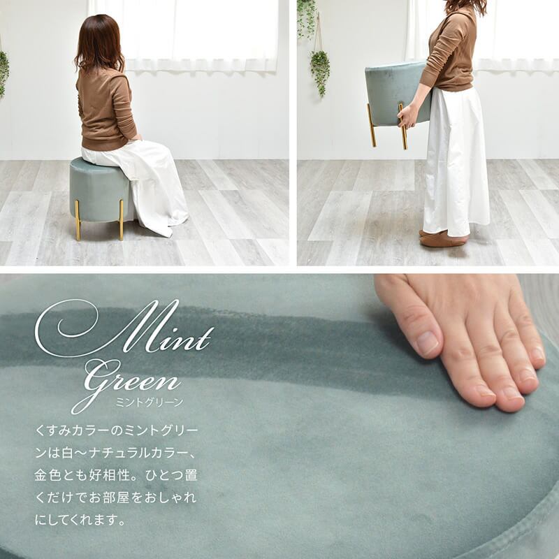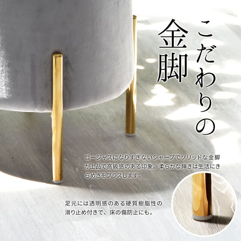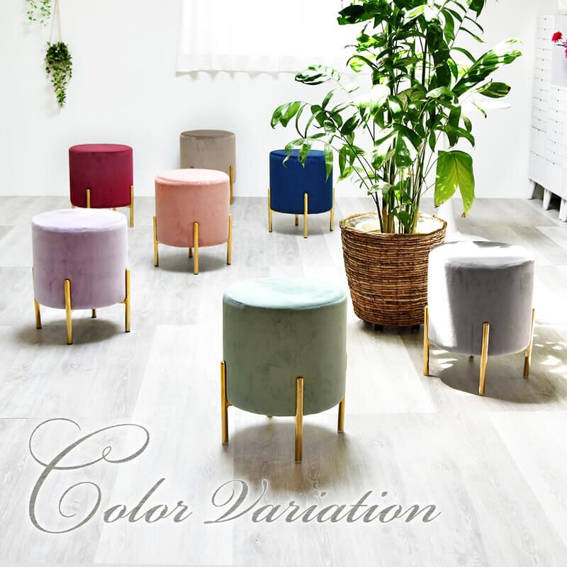 ニュアンスカラーのベロア生地とアンティーク調で細身な金脚がエレガントなコロンとかわいらしい印象を与えるコンパクトな円型スツールです。