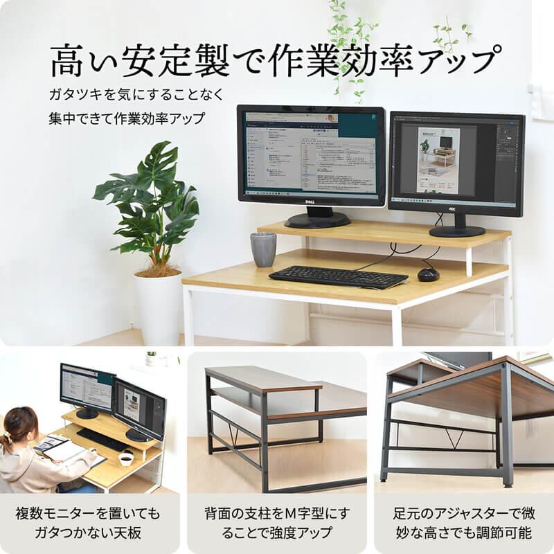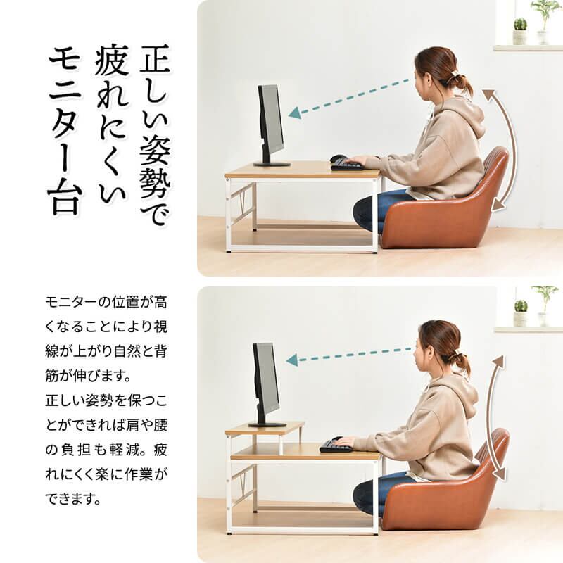 シンプル設計でリラックスした体勢でデスクワークが可能なロータイプのモニター台付きテーブルです。