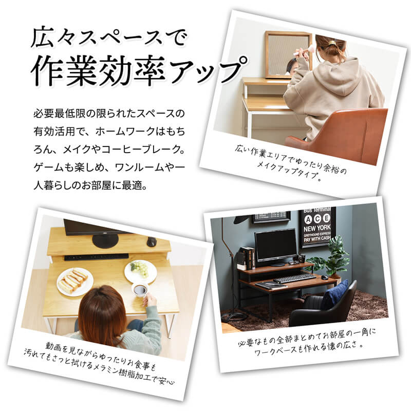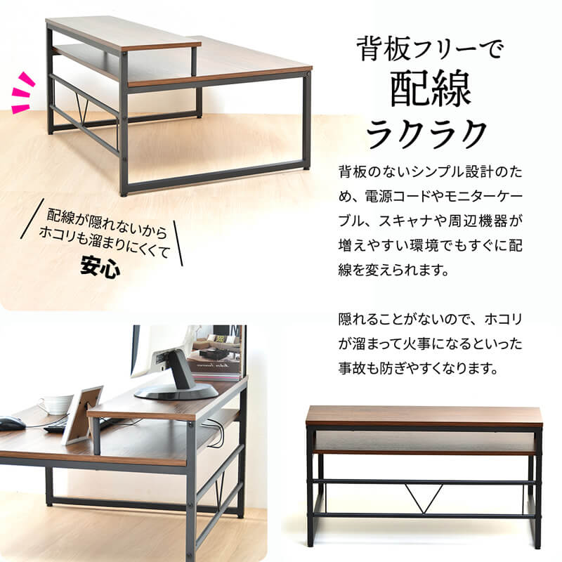 モニター台の下スペースを有効活用できるので天板を広々と使用することができるローデスクです。び