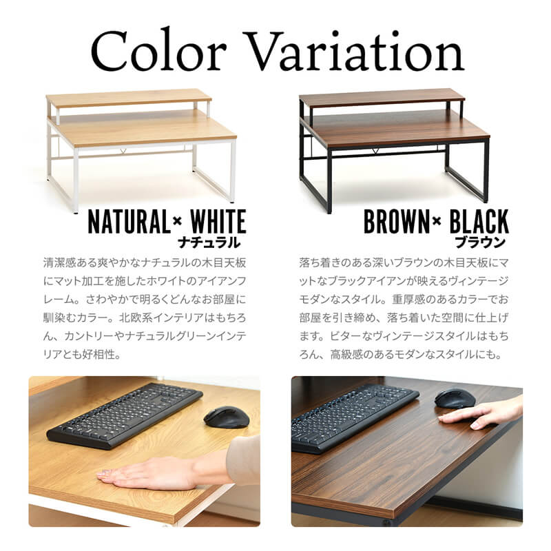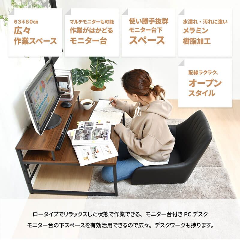 ロータイプでリラックスした状態で作業できる、モニター台付き80cm幅デスクです。