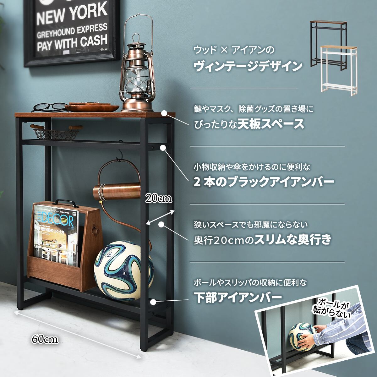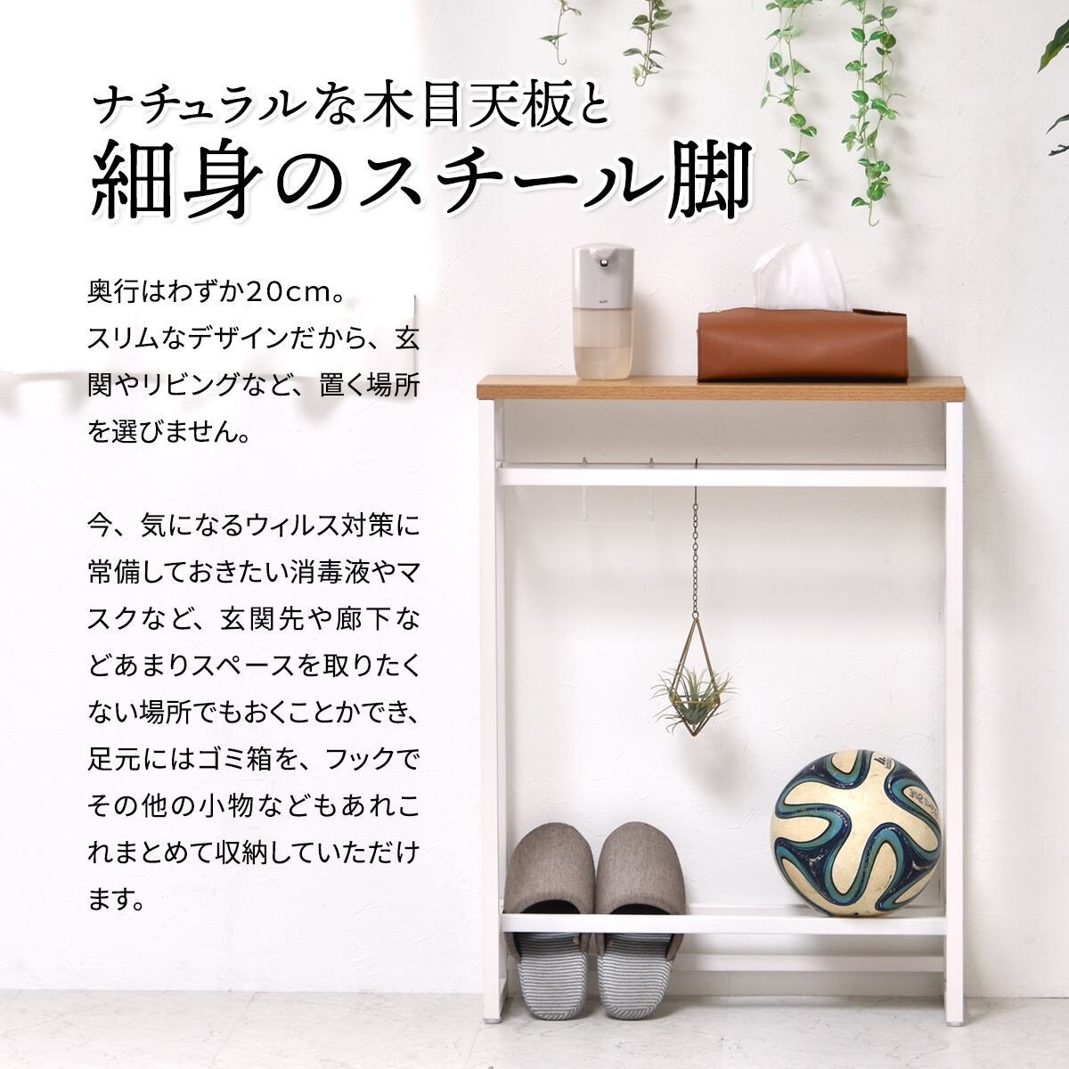 ちょっとした置き場所が欲しい時に便利なコンソールテーブルは、上下に2本のバーがあるので小物や傘の収納、ボールやスリッパの収納にもおすすめです。