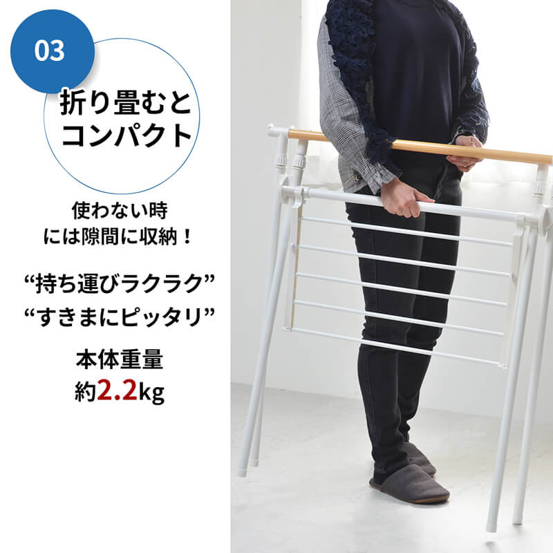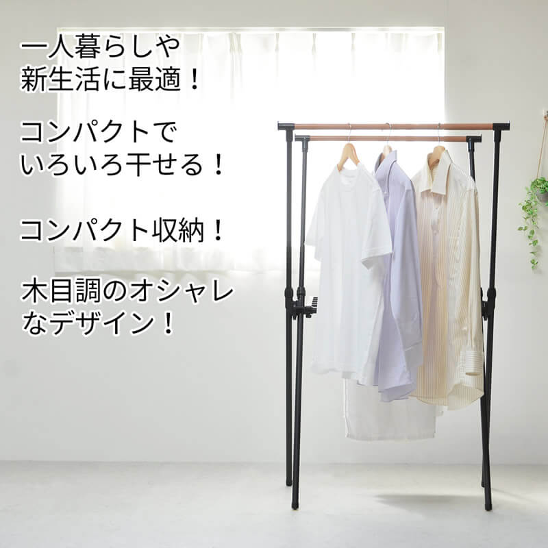 さっと片付けられる折りたたみ式で場所を取らず、1〜2人の洗濯物が干せるので、室内干しやちょっとした洗濯物を干すのに便利なもの干しハンガーラックです。
