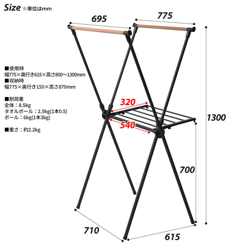 上部のバーはそれぞれ伸縮可能で用途に合わせて調節可能で、機能的にも優れています。