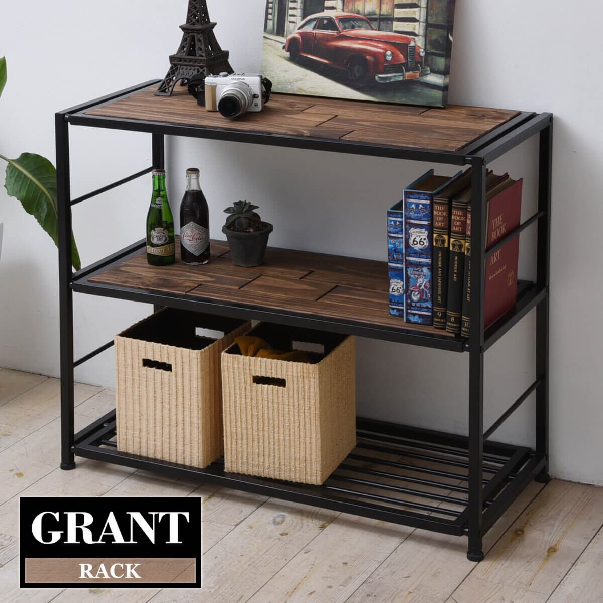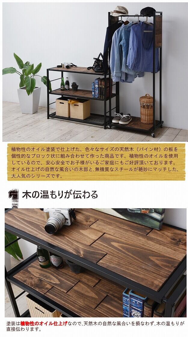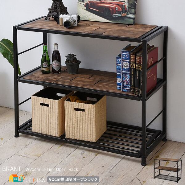 お好みや用途に合わせて木板棚2枚とアイアン棚1枚の上下を入れ替え可能な90cm幅の3段収納ラックです。